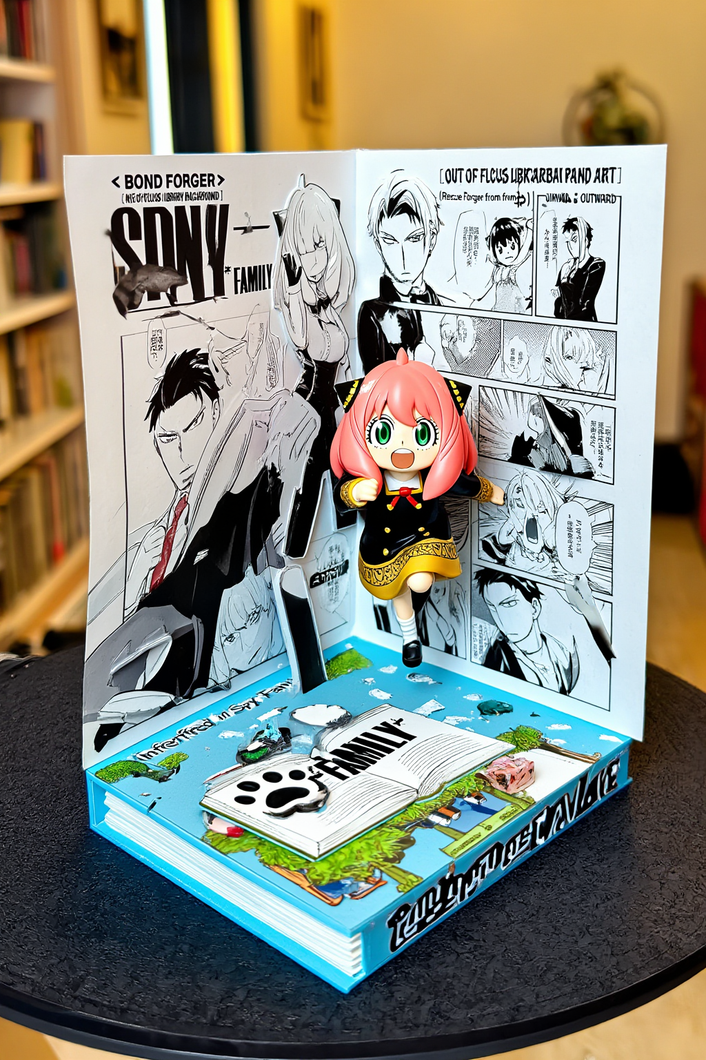 manga <Bond Forger> [ OUT OF FOCUS LIBRARY BACKGROUND ] [ VERTICAL MANGA PANEL ART ] [ (Rescue Scene from Spy x Family) ] | [ 3D Bond Forger JUMPING OUTWARD ] [ (Running Pose, Dynamic Action) ] | [ OPEN BOOK / PAW PRINT / PARK BASE ] [ (Infer based on Spy x Family) ] [ TABLE SURFACE ] INSTRUCTION: Render as a high-end Pop-Up Book aesthetic. The Background is flat paper. The Character is full 3D plastic/resin. Lighting: Toy Photography style (Softbox, vibrant colors).Negative Prompt