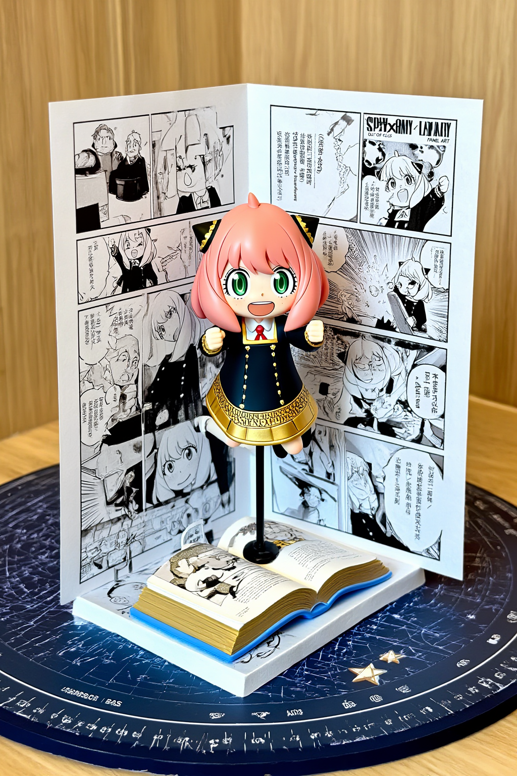 manga <Anya Forger> [ OUT OF FOCUS LIBRARY BACKGROUND ] [ VERTICAL MANGA PANEL ART ] [ (School Scene from Spy x Family) ] | [ 3D Anya Forger JUMPING OUTWARD ] [ (Happy Pose, Dynamic Action) ] | [ OPEN BOOK / STAR STICKER / CLASSROOM BASE ] [ (Infer based on Spy x Family) ] [ TABLE SURFACE ] INSTRUCTION: Render as a high-end Pop-Up Book aesthetic. The Background is flat paper. The Character is full 3D plastic/resin. Lighting: Toy Photography style (Softbox, vibrant colors).Negative Prompt