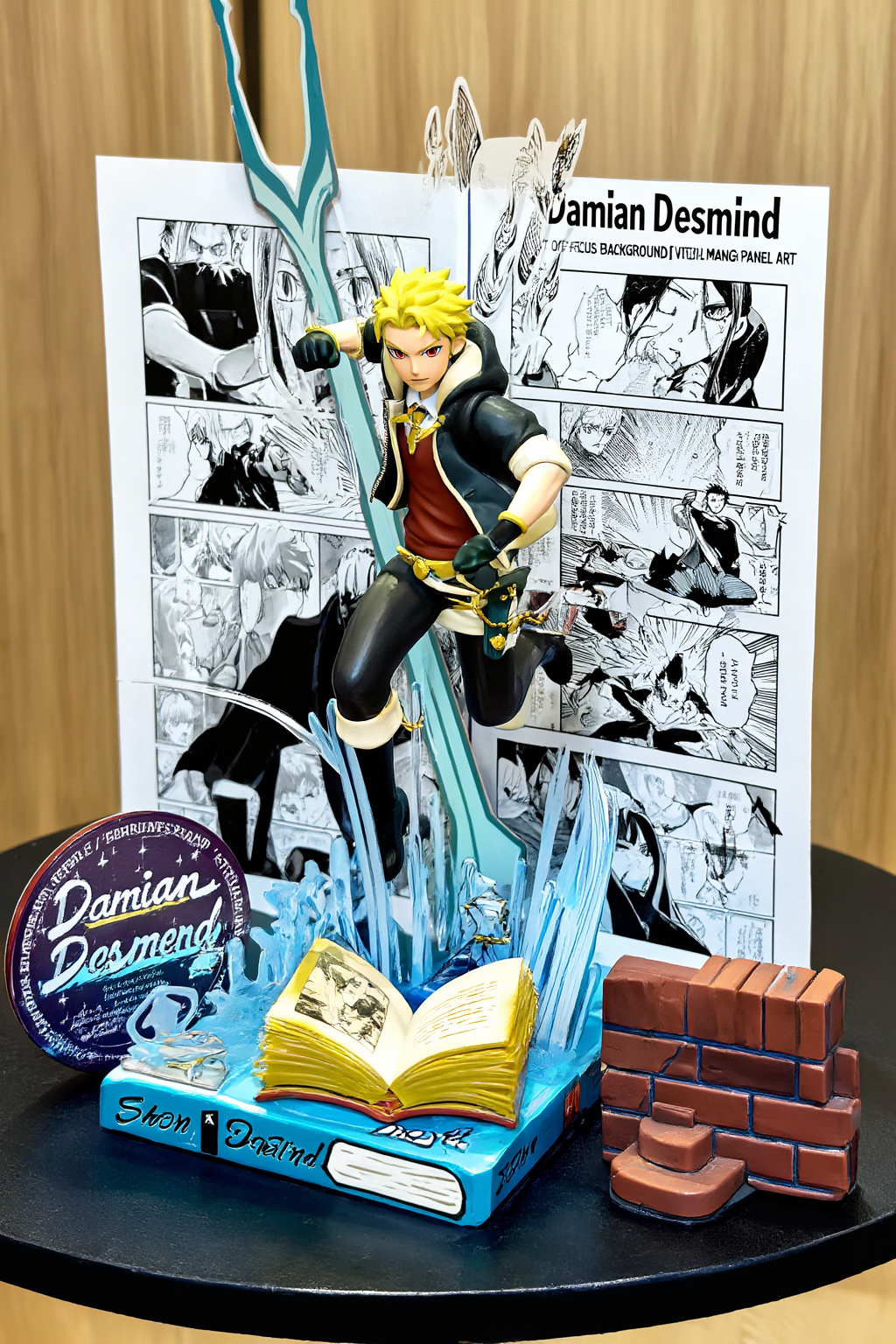 manga <Damian Desmond> [ OUT OF FOCUS LIBRARY BACKGROUND ] [ VERTICAL MANGA PANEL ART ] [ (Academy Scene from Spy x Family) ] | [ 3D Damian Desmond JUMPING OUTWARD ] [ (Proud Pose, Dynamic Action) ] | [ OPEN BOOK / SCHOOL BADGE / BRICK BASE ] [ (Infer based on Spy x Family) ] [ TABLE SURFACE ] INSTRUCTION: Render as a high-end Pop-Up Book aesthetic. The Background is flat paper. The Character is full 3D plastic/resin. Lighting: Toy Photography style (Softbox, vibrant colors).Negative Prompt