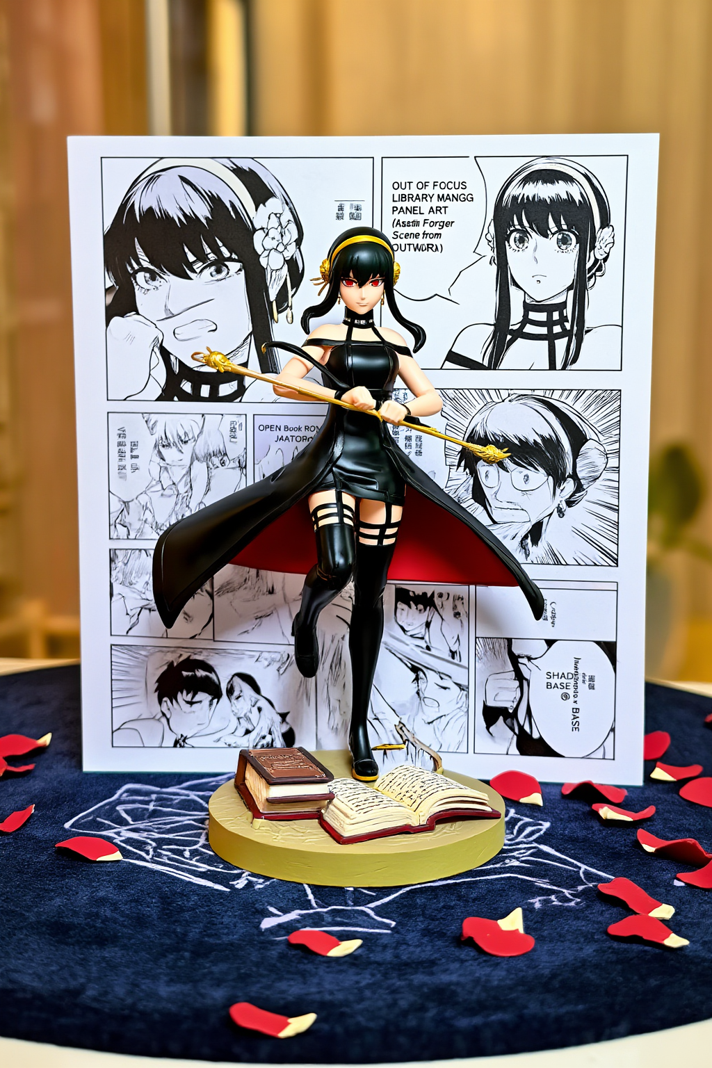 manga <Yor Forger> [ OUT OF FOCUS LIBRARY BACKGROUND ] [ VERTICAL MANGA PANEL ART ] [ (Assassin Scene from Spy x Family) ] | [ 3D Yor Forger JUMPING OUTWARD ] [ (Needle Strike, Dynamic Action) ] | [ OPEN BOOK / ROSE PETAL / SHADOW BASE ] [ (Infer based on Spy x Family) ] [ TABLE SURFACE ] INSTRUCTION: Render as a high-end Pop-Up Book aesthetic. The Background is flat paper. The Character is full 3D plastic/resin. Lighting: Toy Photography style (Softbox, vibrant colors).Negative Prompt