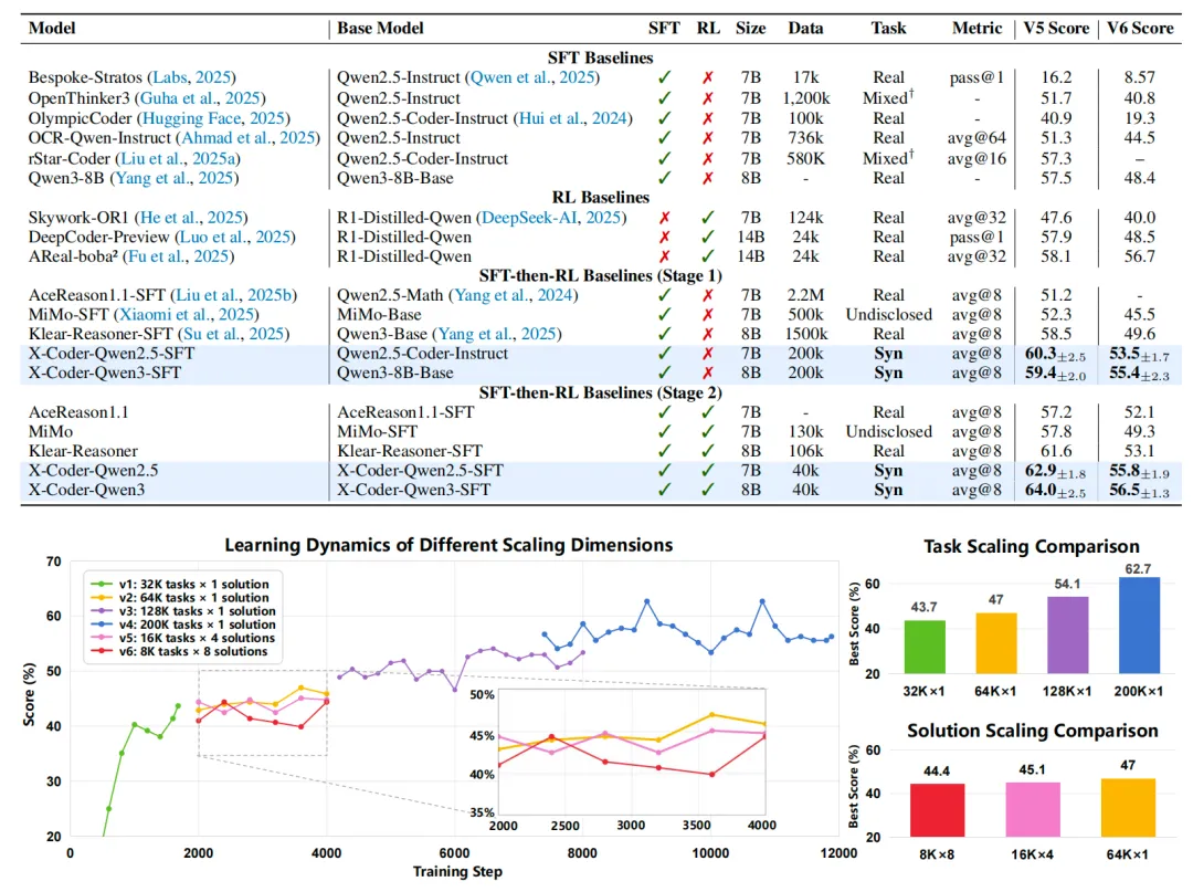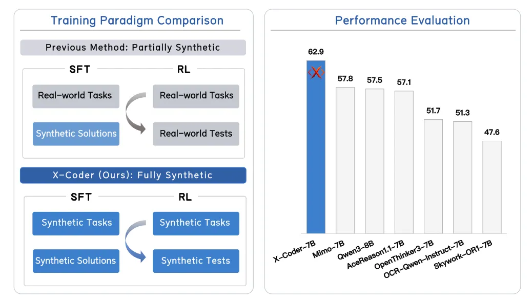 近日,来自微软和清华大学的研究团队联合发表了一项突破性研究,给出了肯定答案。他们提出了一种全新的数据合成与模型训练范式,并开源了 X-Coder 系列模型。令人瞩目的是,在完全不使用任何真实竞赛题目的情况下,仅有 7B 参数的 X-Coder-7B 模型在极具挑战的 LiveCodeBench v5 上取得了 62.9% 的优异成绩,显著超越了更大参数量且依赖真实数据的传统模型。