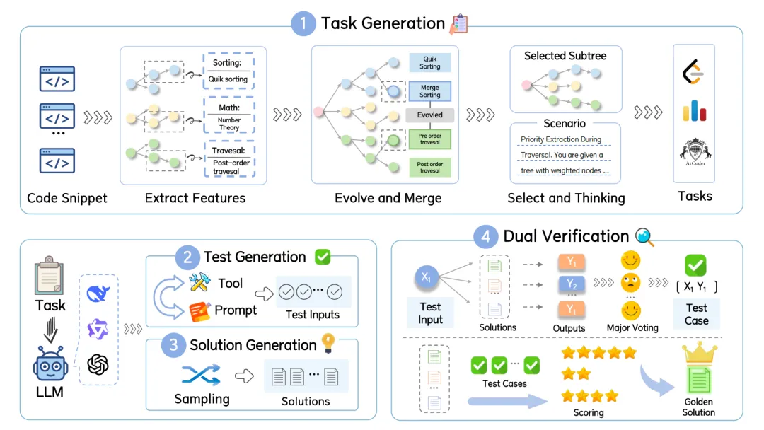 纯合成数据的难点在于如何保证答案和测试用例的绝对正确。团队采用了多路采样的多数投票机制:为每道题生成 8 个候选代码,并在合成的测试用例上交叉执行,选出一致性最高的输出。同时,引入基于难度的权重打分系统,最终筛选出”黄金答案”。