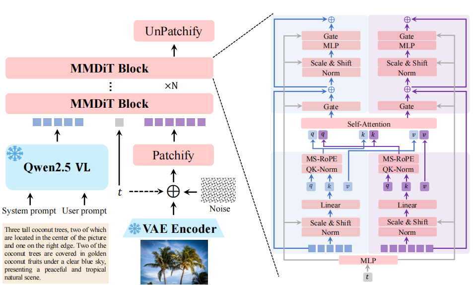 他们直接使用了 Qwen2.5-VL 多模态大模型作为条件编码器。这个选择很聪明,因为 VL 模型本身就具备图文理解能力,能够更好地理解文本和图像之间的语义关系。而且原生支持中文,解决了我们之前遇到的中文处理问题。