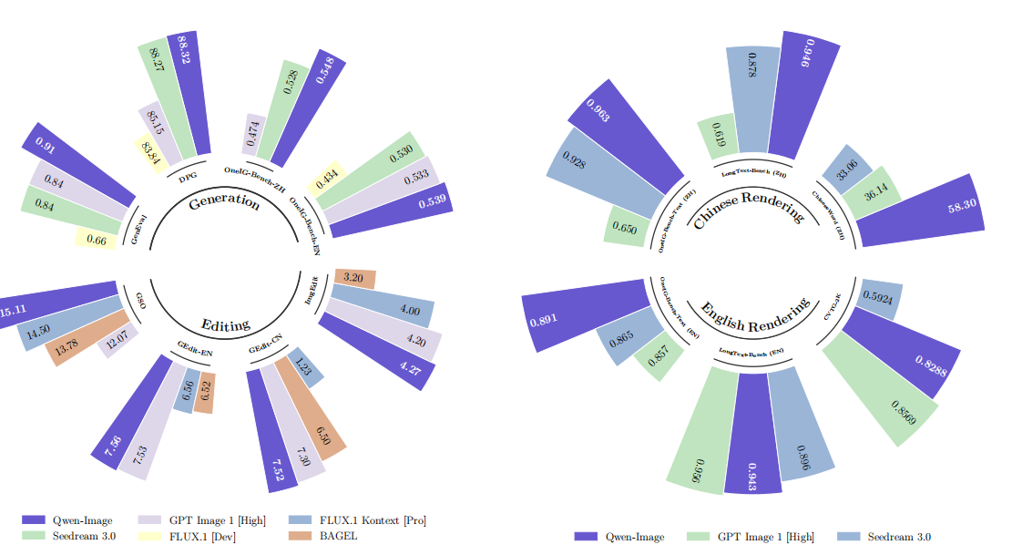 Qwen-Image 在多个公开基准测试中都表现出了明显的优势: