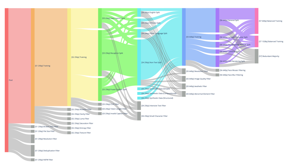 训练一个高质量的 AI 模型,数据质量比数据数量更重要。Qwen-Image 团队设计了一个七级数据精馏管线,把 5B 原始图文对浓缩为 1.2B 高质量样本。