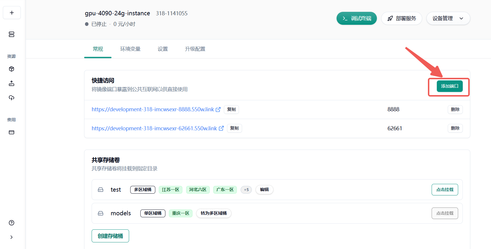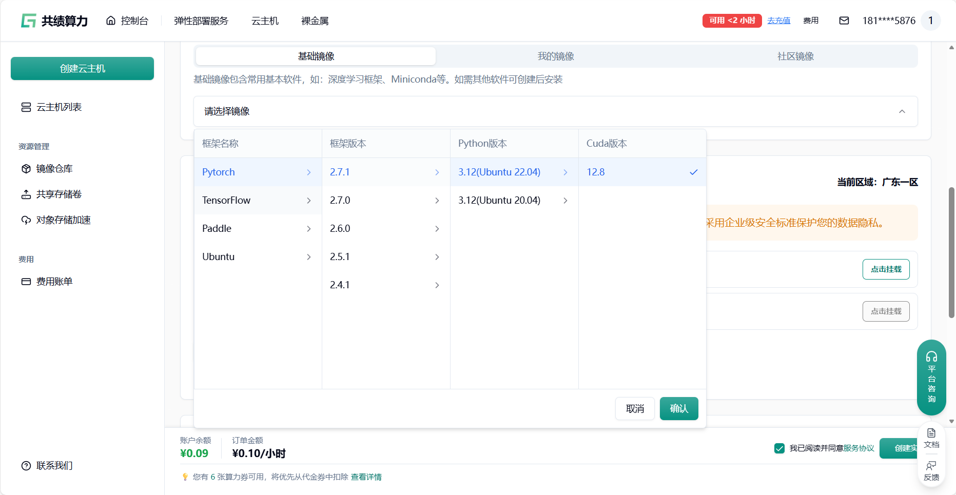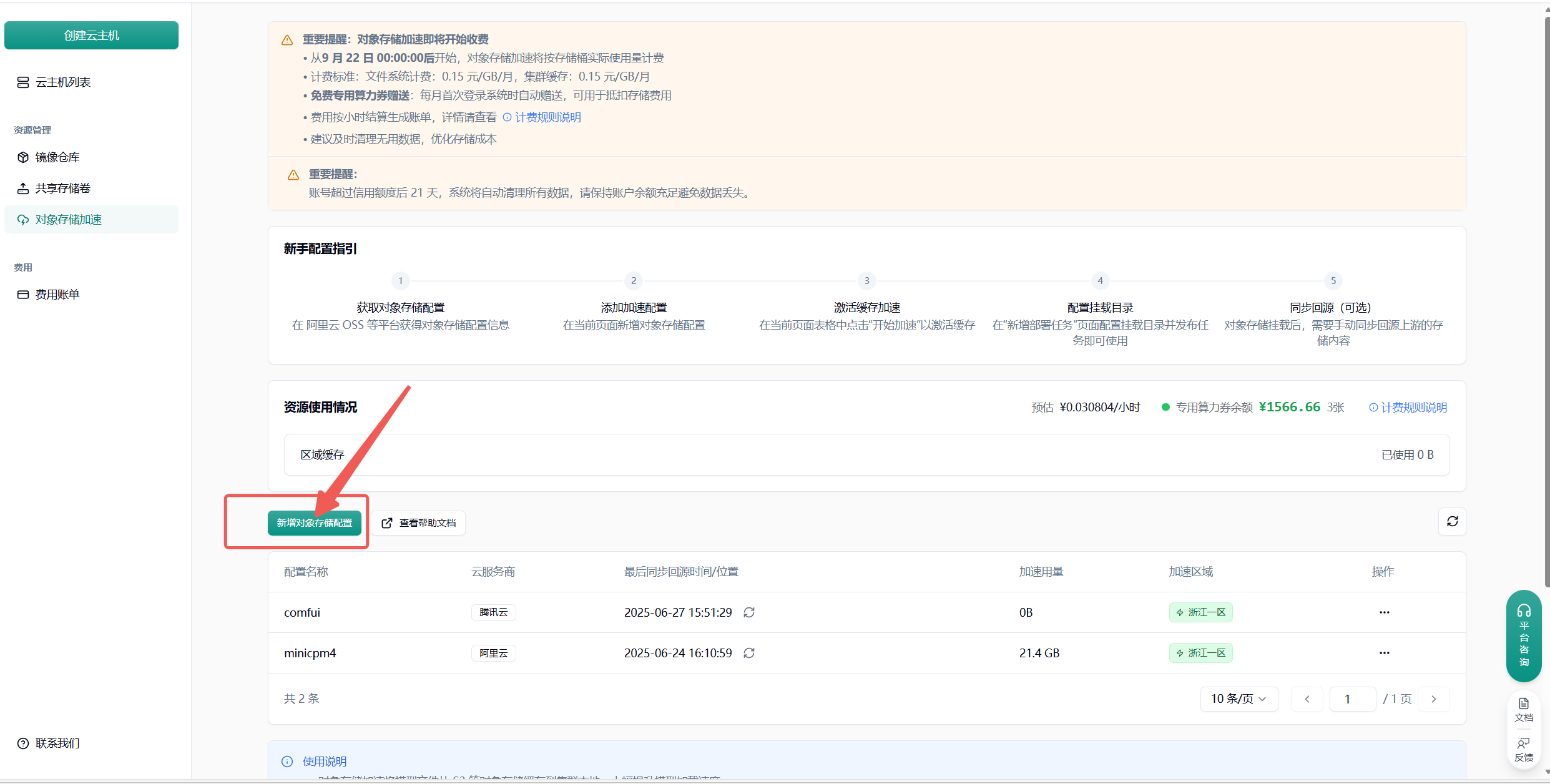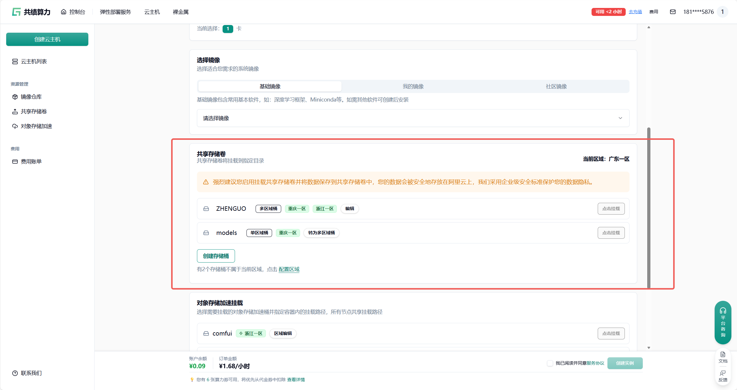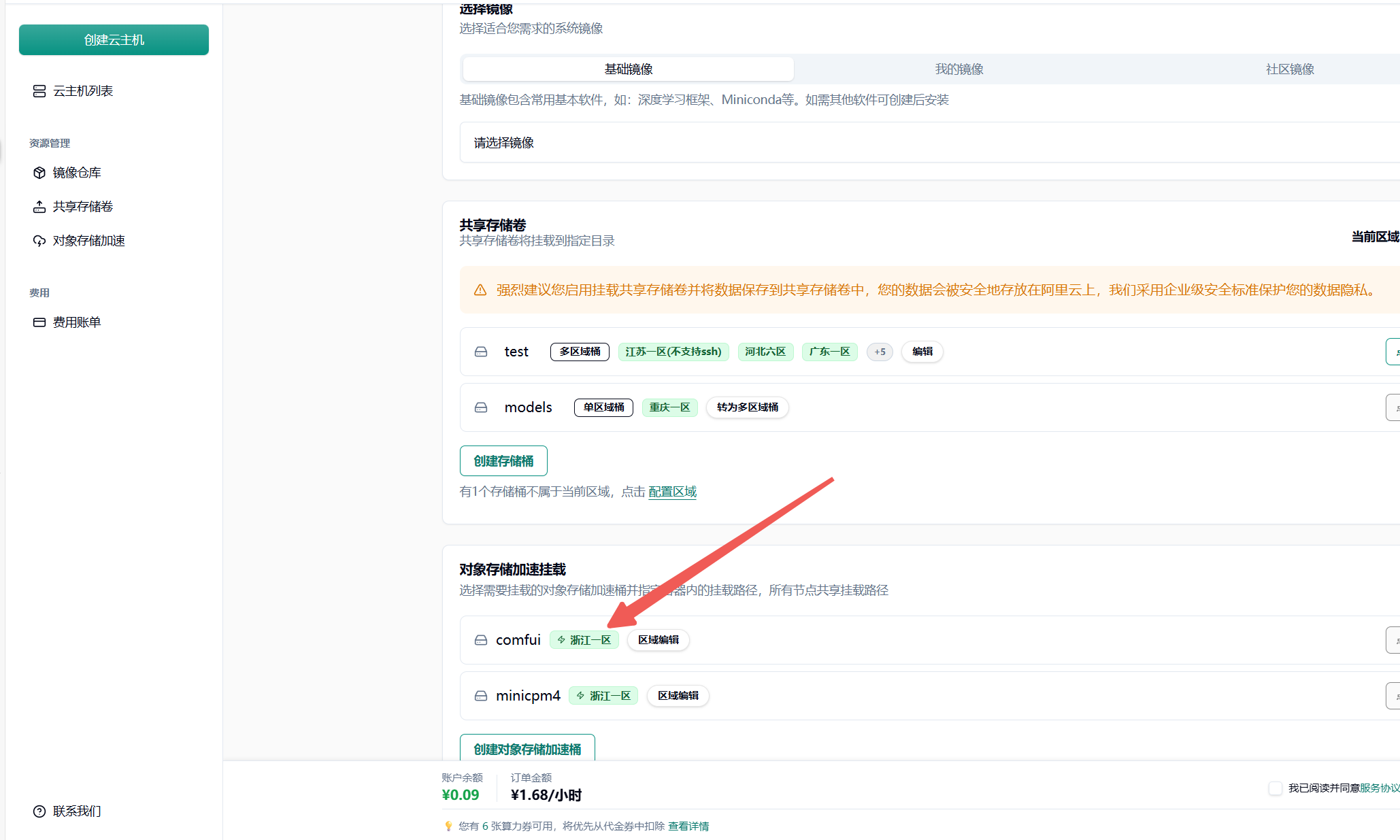 先选择 GPU、GPU 区域(需要与对象存储选择的加速区域一致)。我的对象存储加速了“浙江一区”,所以我选择“浙江一区”的 4090 GPU。