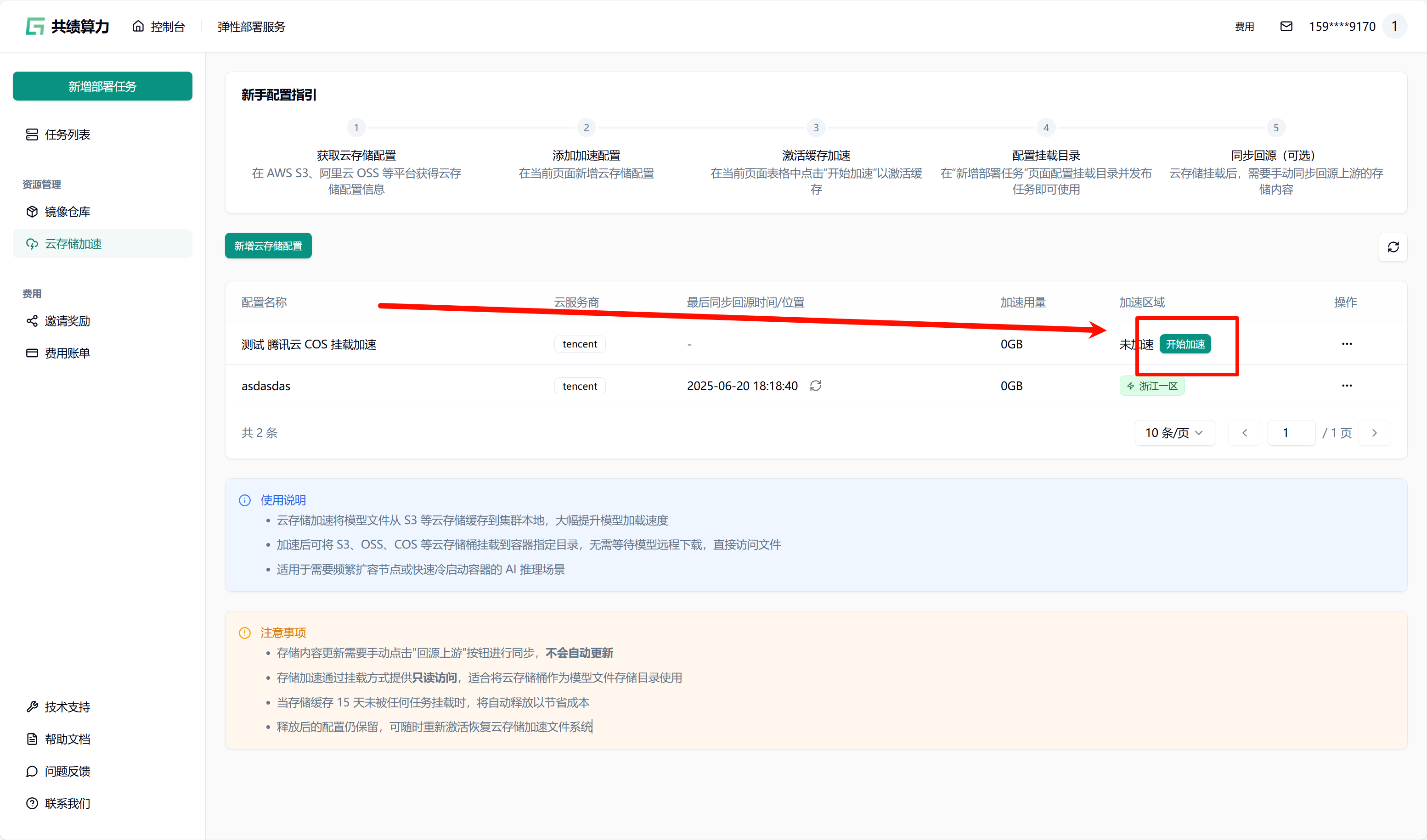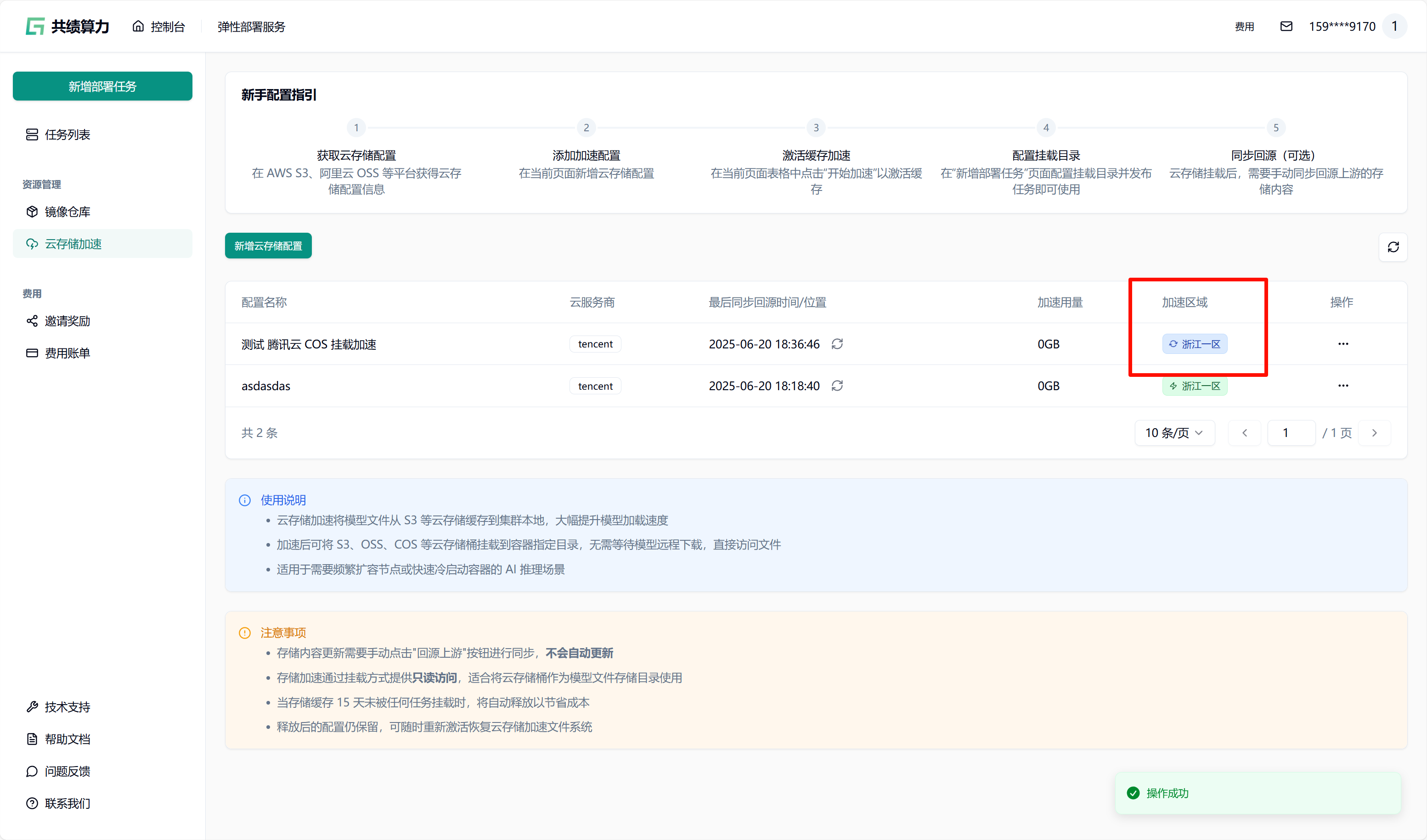 当执行保存配置操作时,系统会自动对配置的可用性进行检测。只有在校验通过之后,配置才可成功保存。在列表中查找到相应配置后,点击“开始加速”选项,接着选择加速区域,此时系统将自动对 JuiceFS 文件系统进行初始化(此过程约需 1 - 2 分钟,期间状态会从蓝色转变为绿色,状态为绿色时已可以挂载此存储桶)。同时,系统还会执行提前预热操作(此操作需从云端将文件下载至本地,因此需等待一定时长。例如,若文件大小为 6.6 G,下载完成大约需要 30 分钟)。
