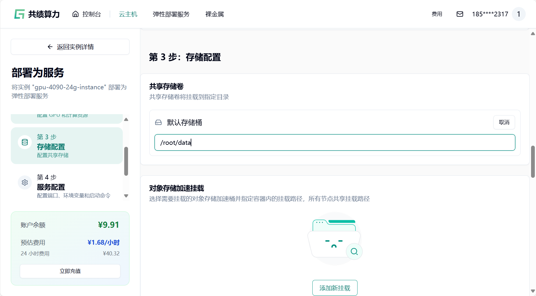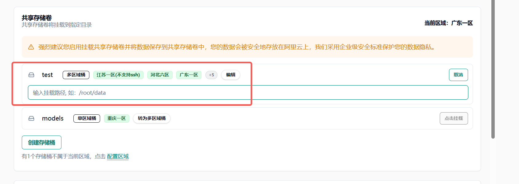 注意:挂载存储的时候,不要直接挂载到/、/root、 /root/目录,否则会出现一些奇怪的问题。建议挂载在类似/root/data、/root/code 之类的二级目录。