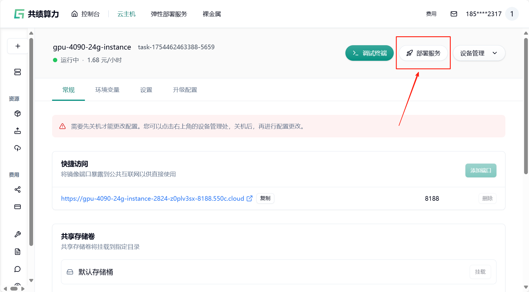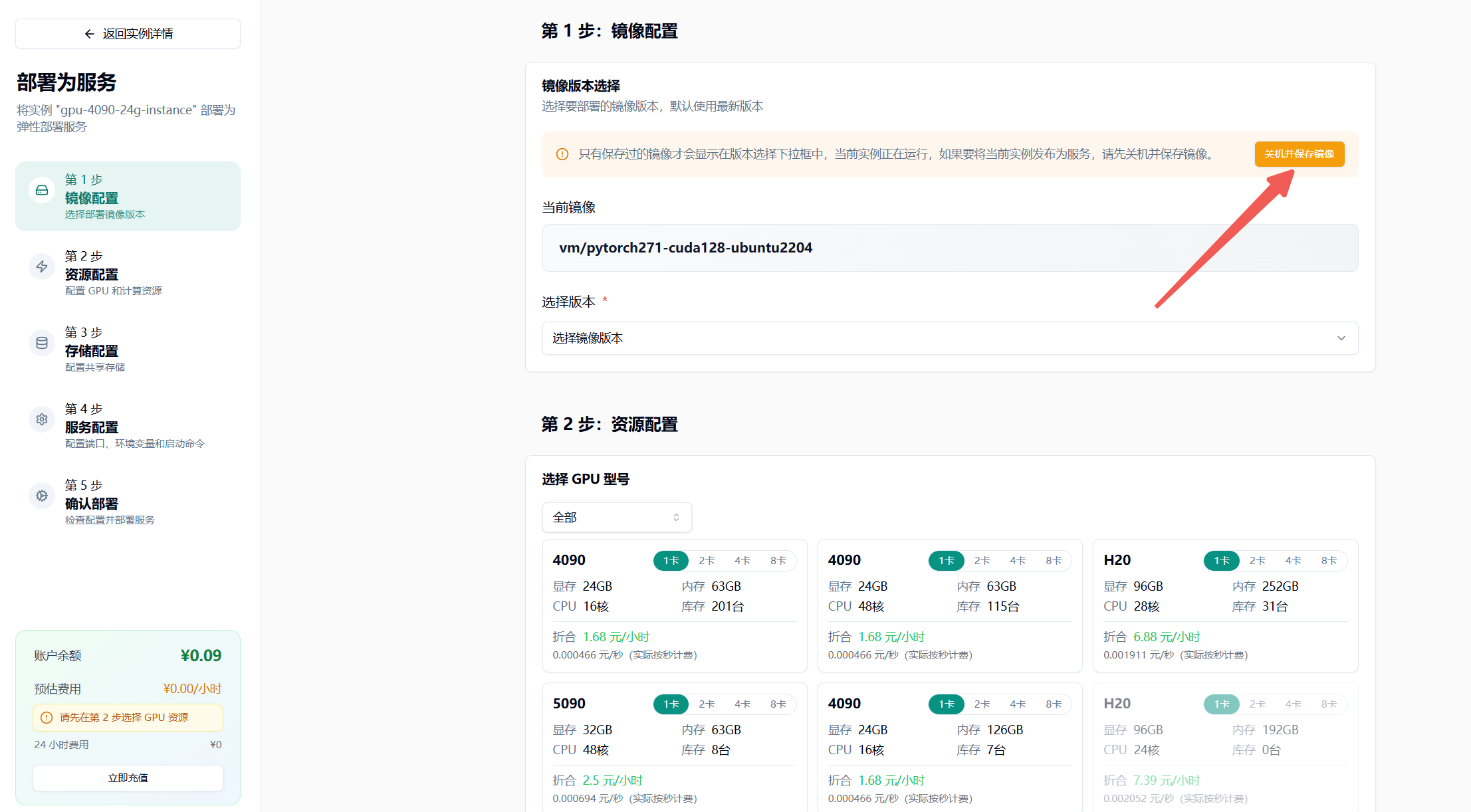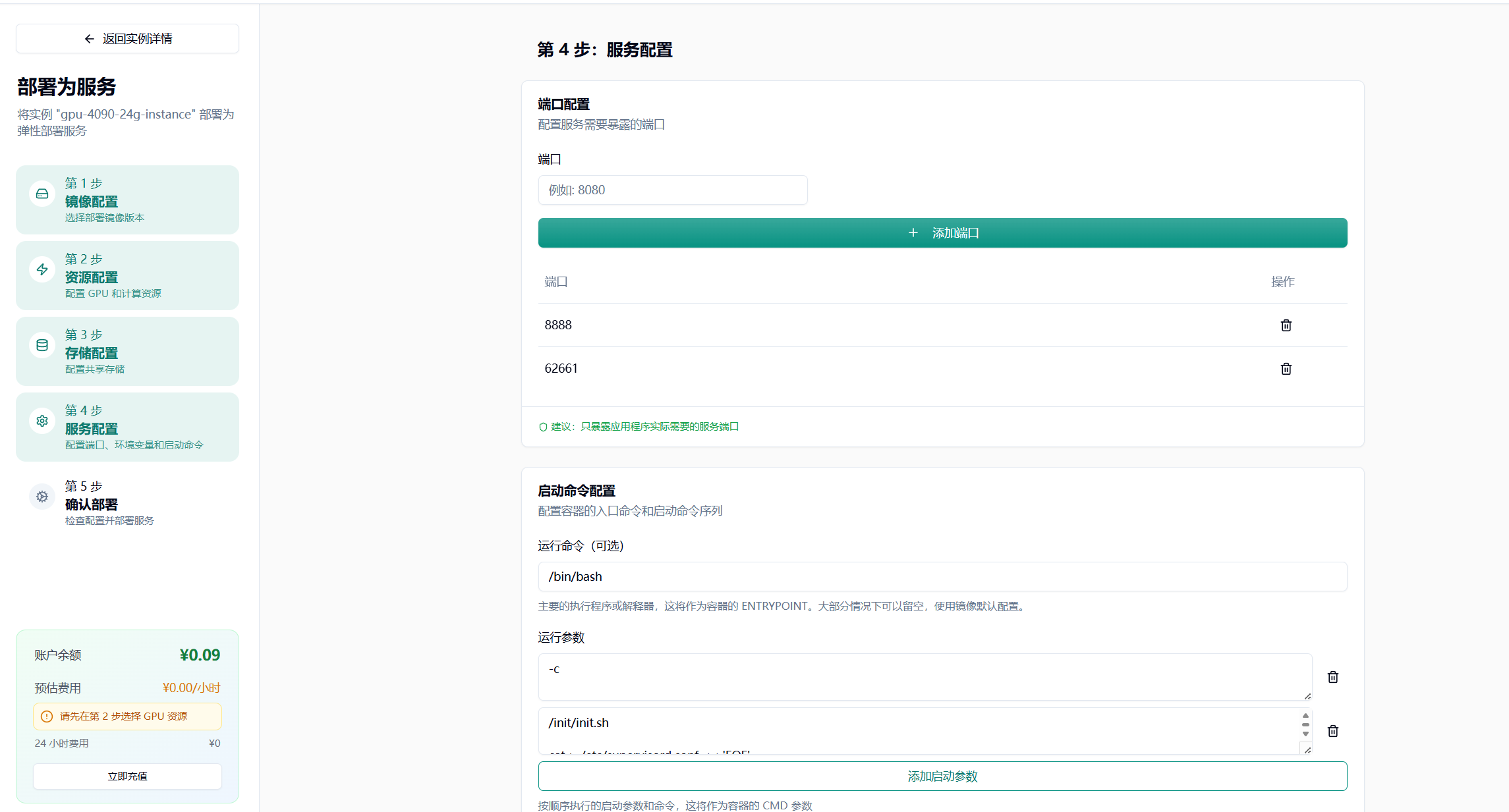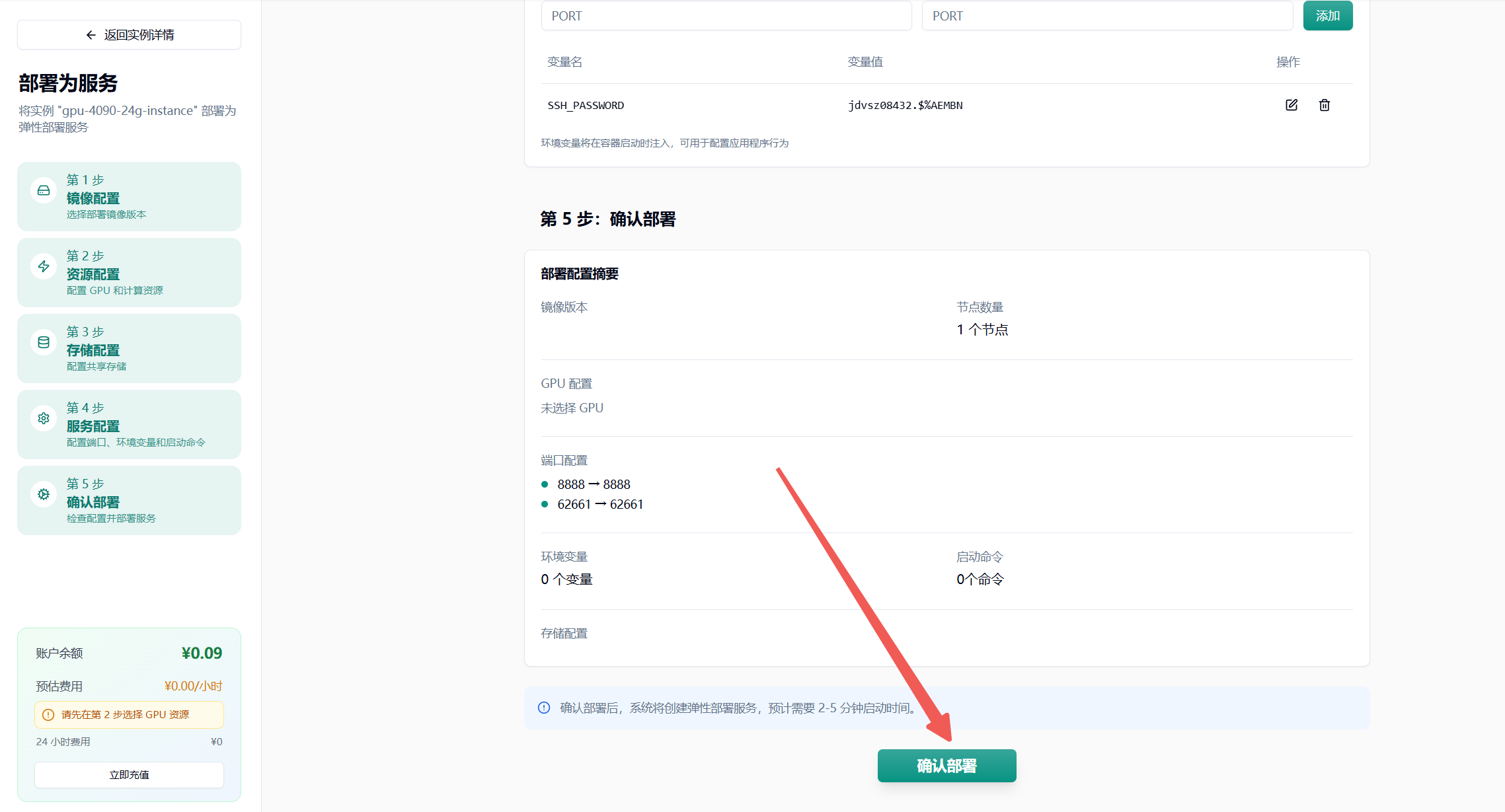 - 选择 GPU 配置(如 4090),节点默认选择 1 个