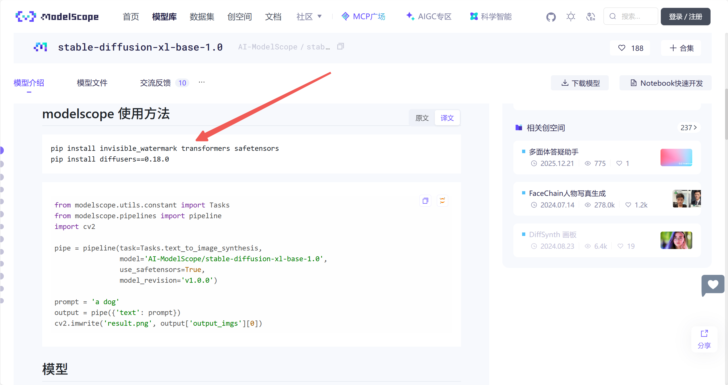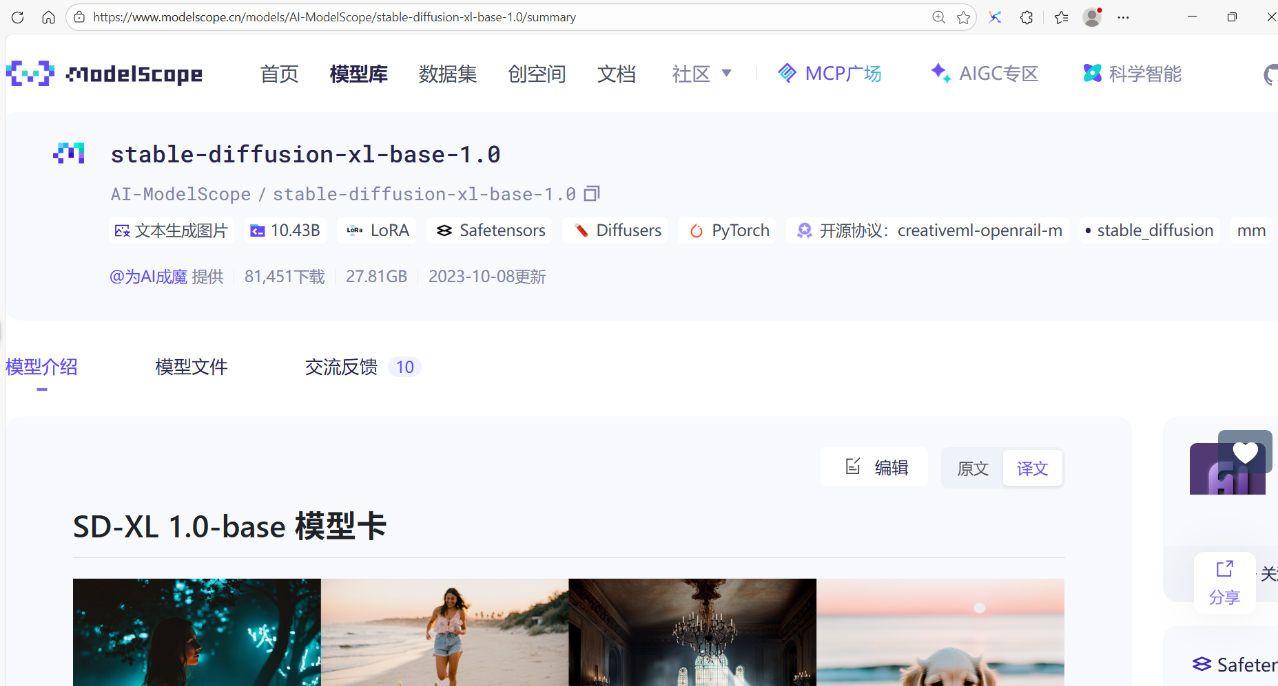 模型链接:https://www.modelscope.cn/models/AI-ModelScope/stable-diffusion-xl-base-1.0/summary