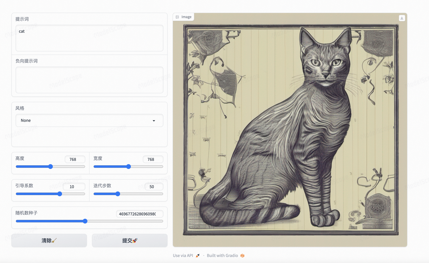 pipe = pipeline(task=Tasks.text_to_image_synthesis, model='AI-ModelScope/stable-diffusion-v1-5', use_safetensors=True, model_revision='v1.0.0')4.基于 gradio 的界面构建