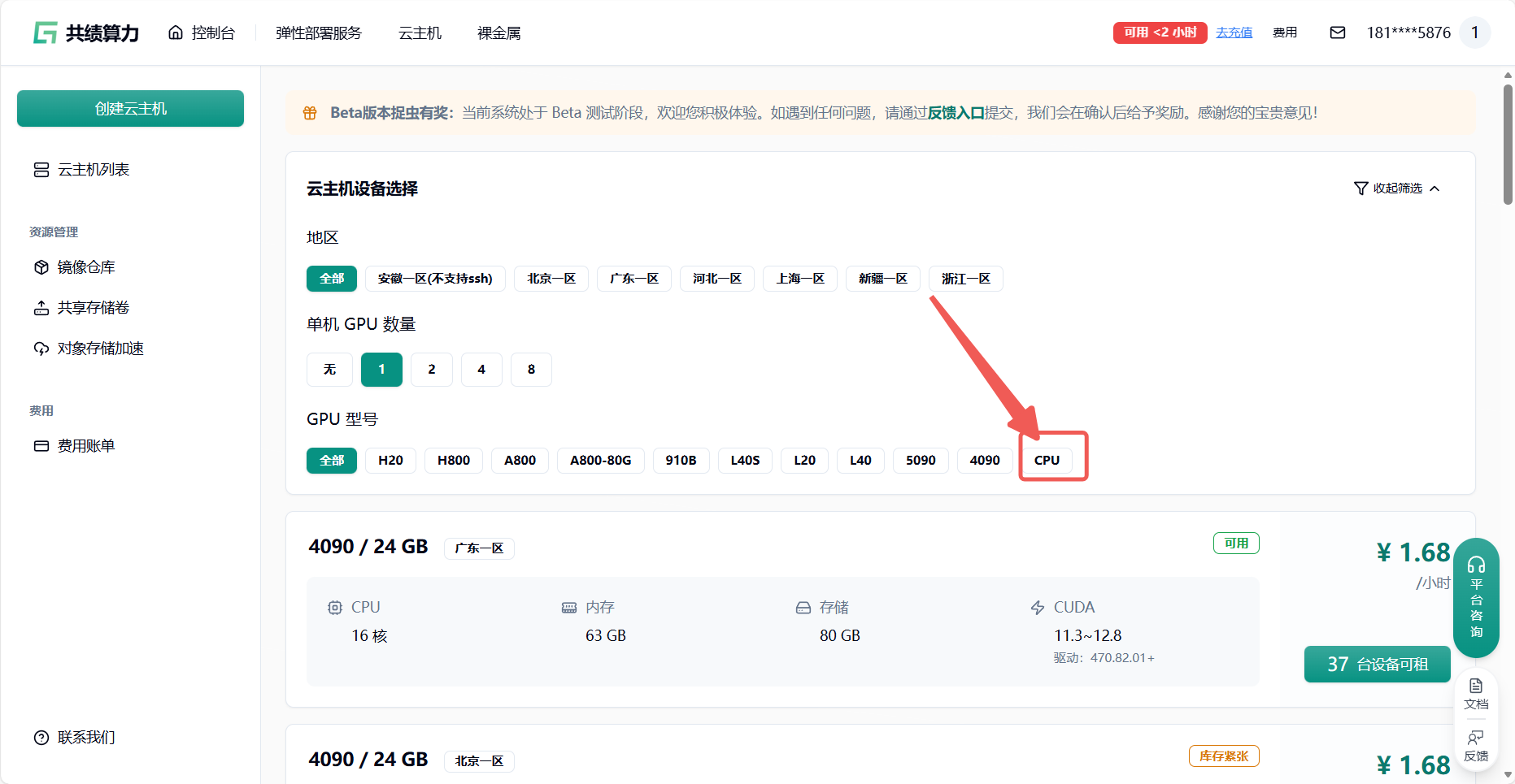 登录共绩算力云主机,选择合适的云主机设备(大部分情况选择 4090 即可,如果需要先下载模型的情况。可以选择 CPU 启动 节省成本)