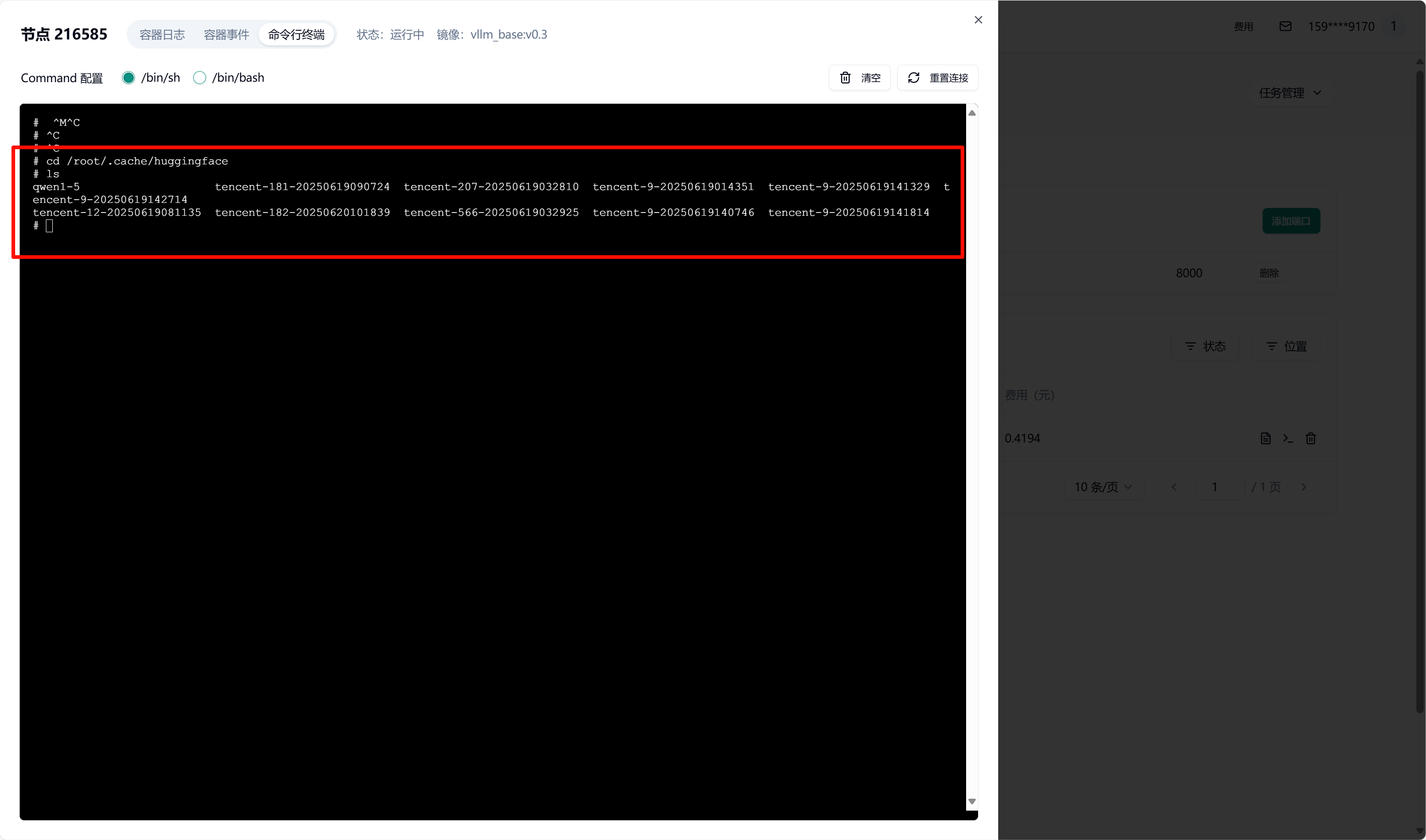 我这里将对象存储 Bucket 中的 /qwen1-5/hub/挂载到了容器中的 /root/.cache/huggingface 目录中