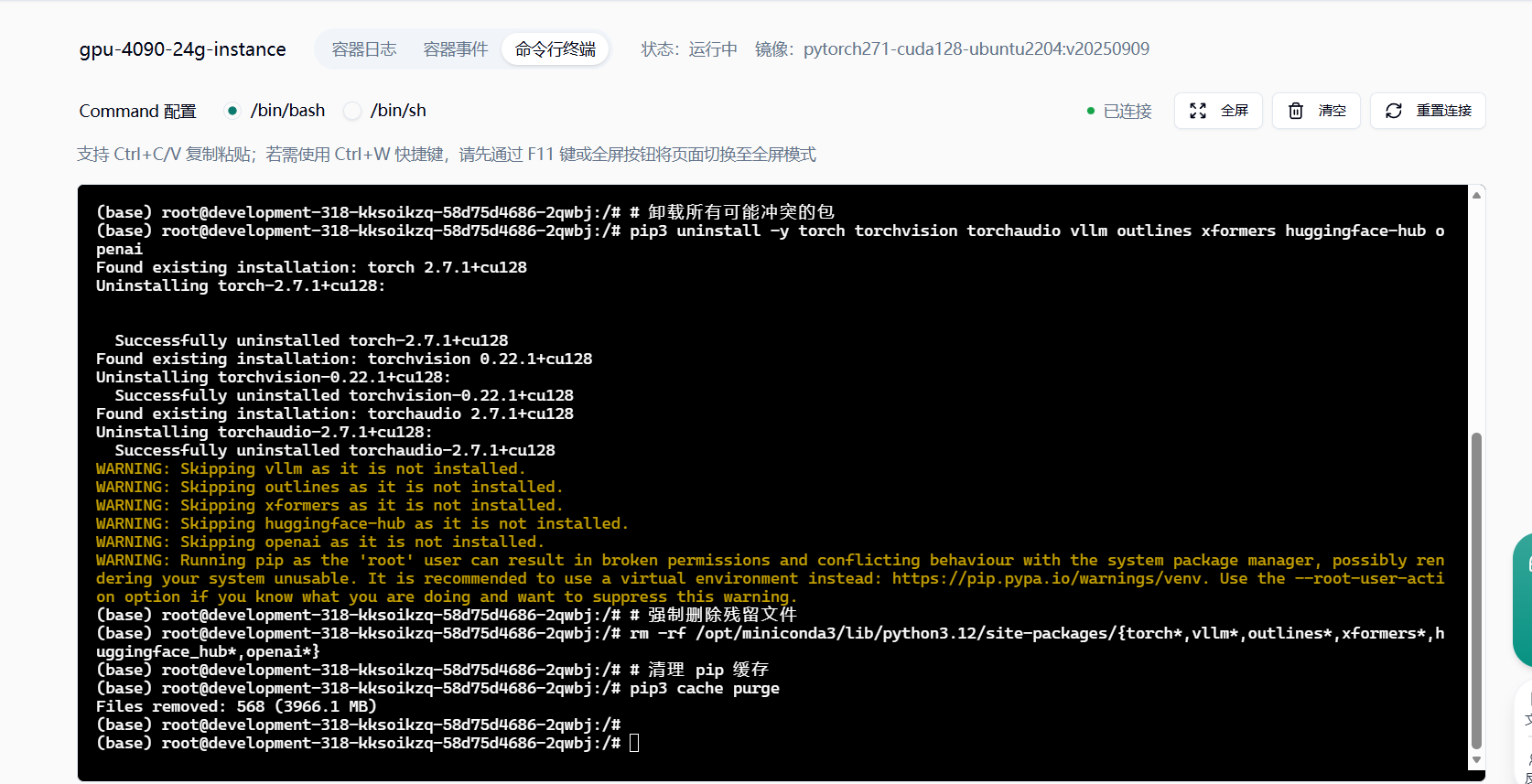 rm -rf /opt/miniconda3/lib/python3.12/site-packages/{torch*,vllm*,outlines*,xformers*,huggingface_hub*,openai*}