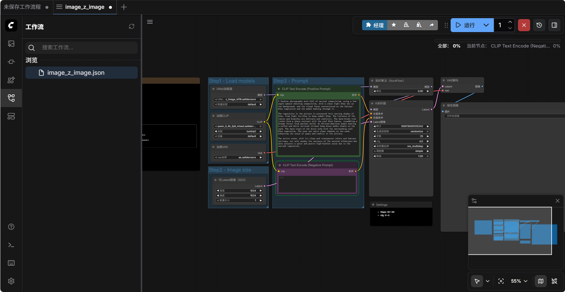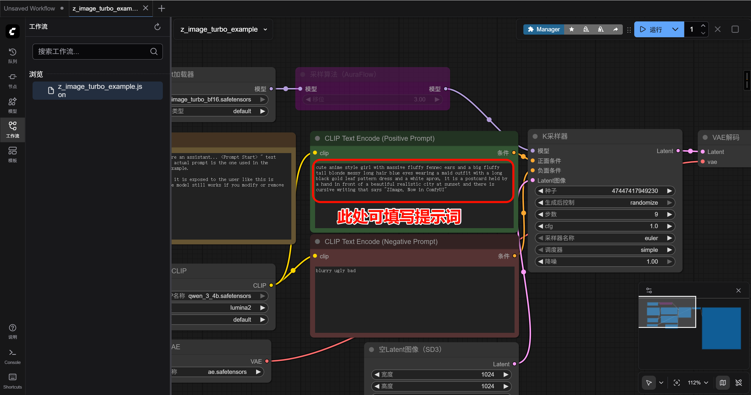 进入 comfyui 界面以后按下图序号先选择左侧栏的工作流菜单,再点击打开默认的 z_image_example.json 文件,此时可以发现这是一份默认的测试工作流