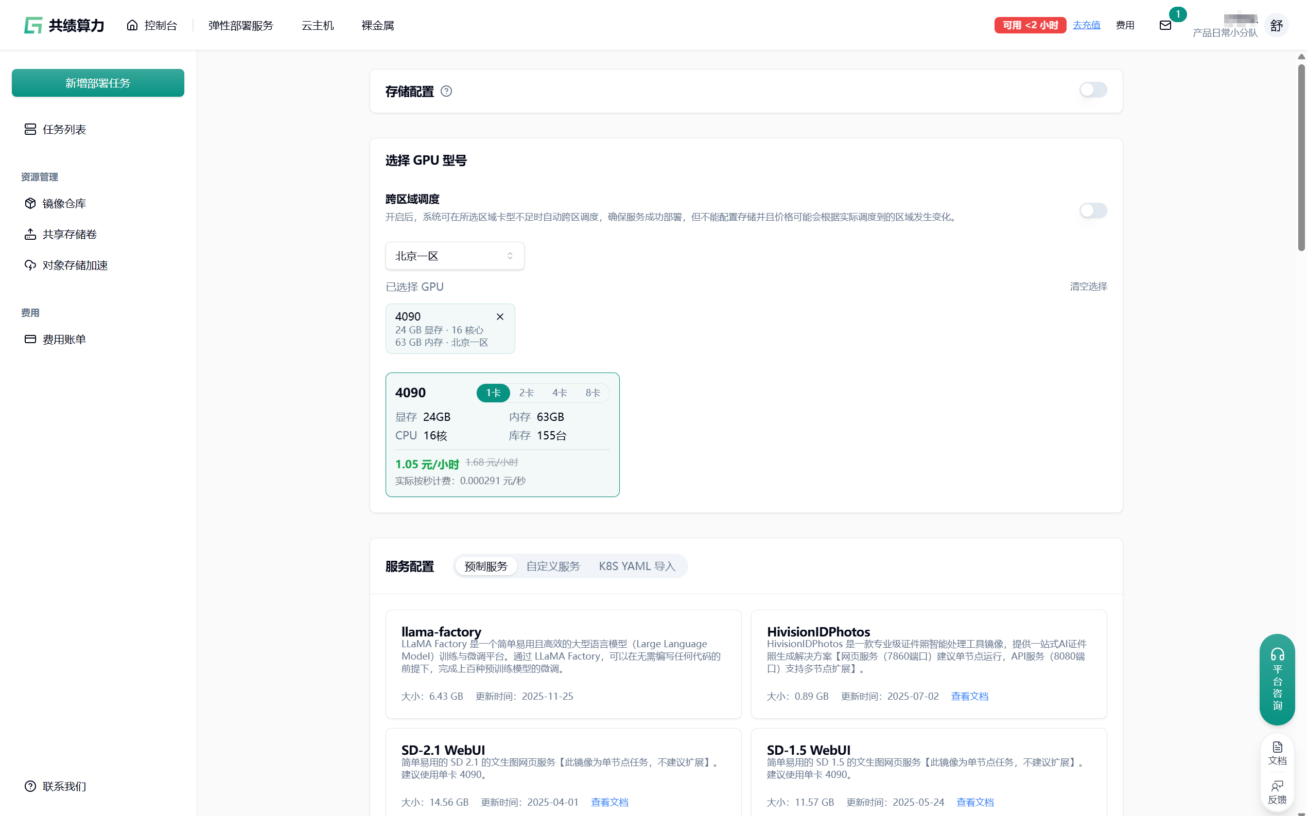 Section titled “方式一:使用预制镜像发布任务(推荐)”Step 1:新增部署任务