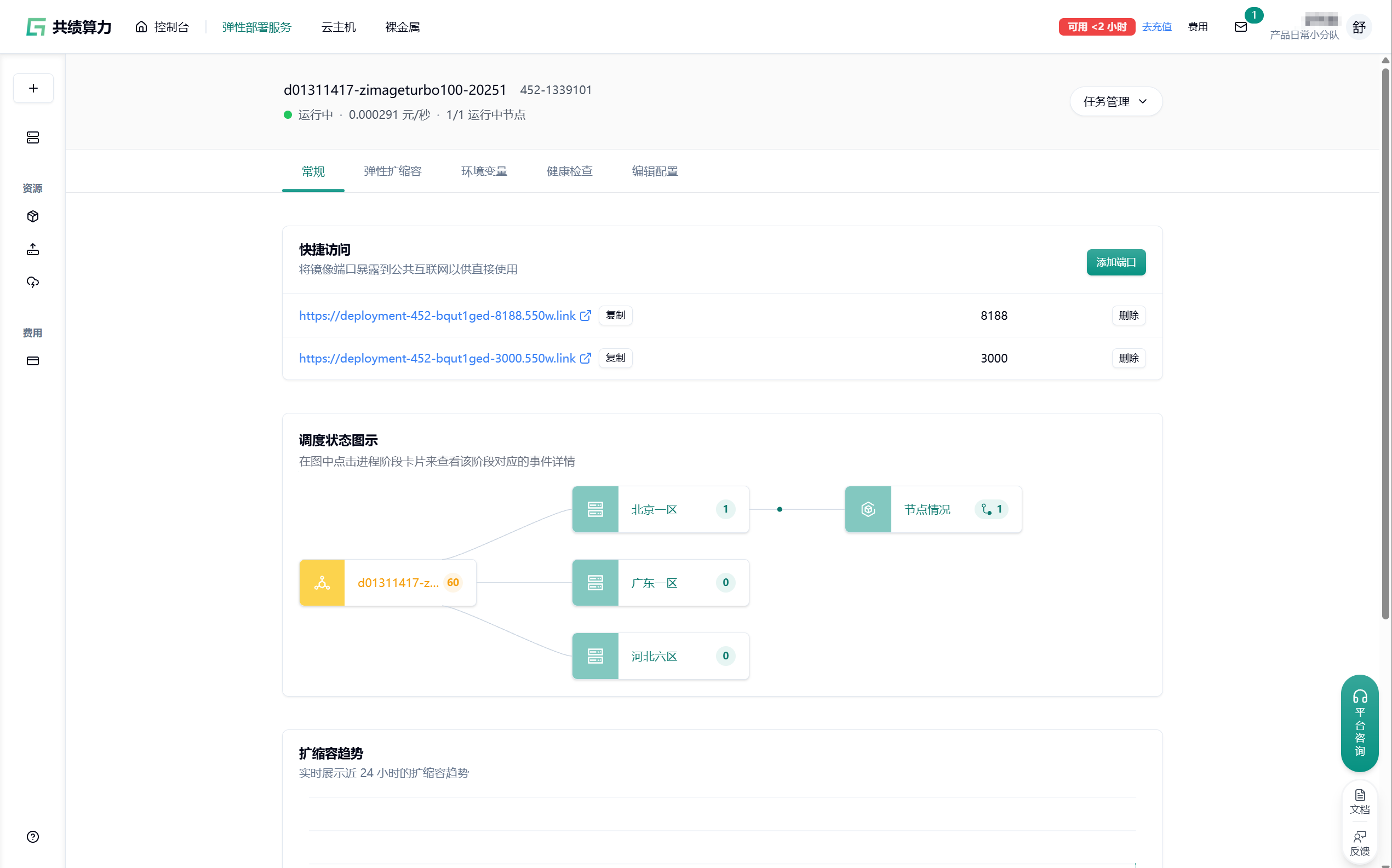 当节点分配完成后,在「快捷访问」区域选择对应服务访问或 API 调用,具体使用方法可以参考对应镜像文档。