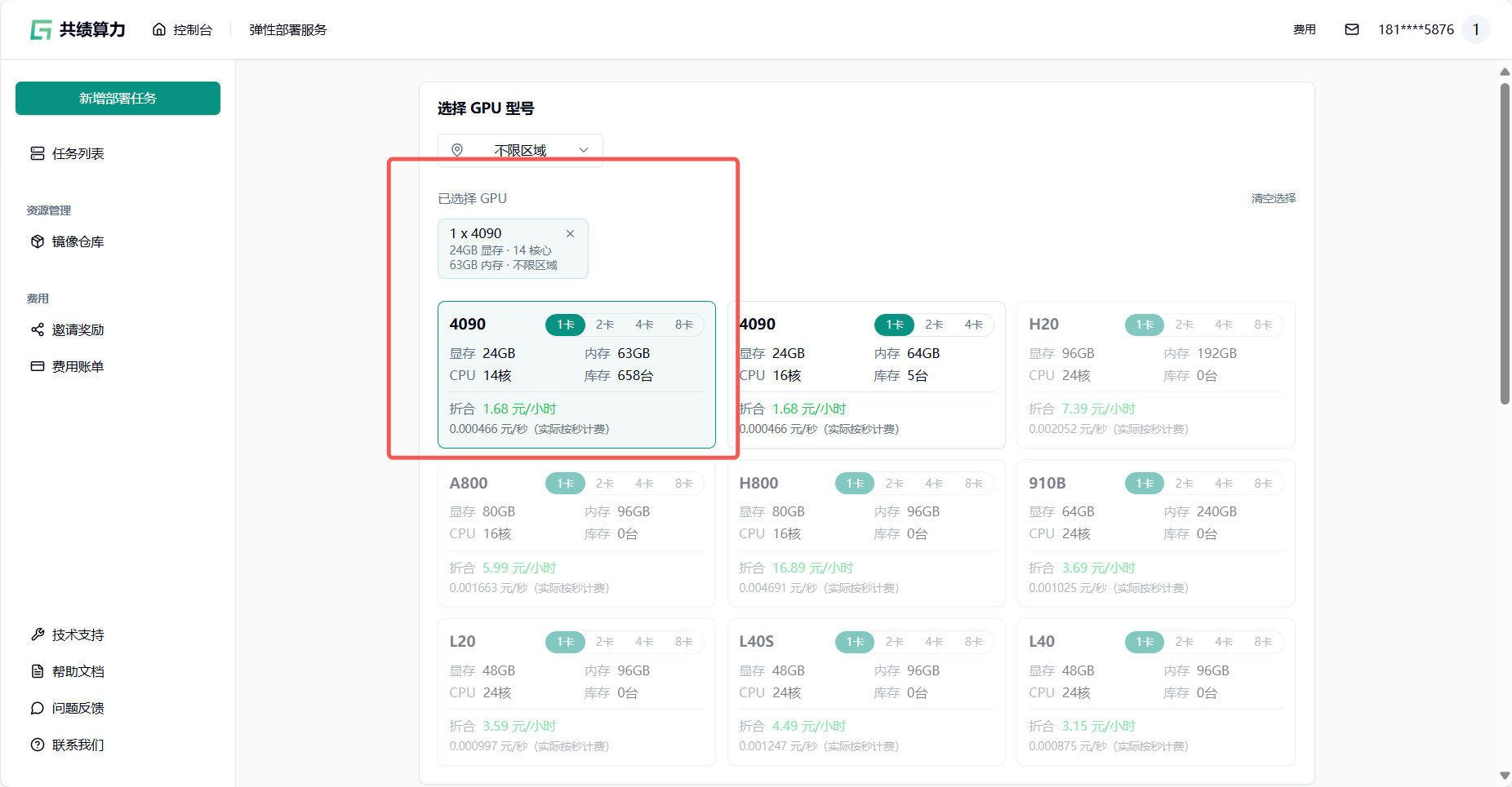 Section titled “1.1 选择 GPU 型号”选择 GPU 型号:推荐选择不限区域——享受全国闲置算力资源 随取随用