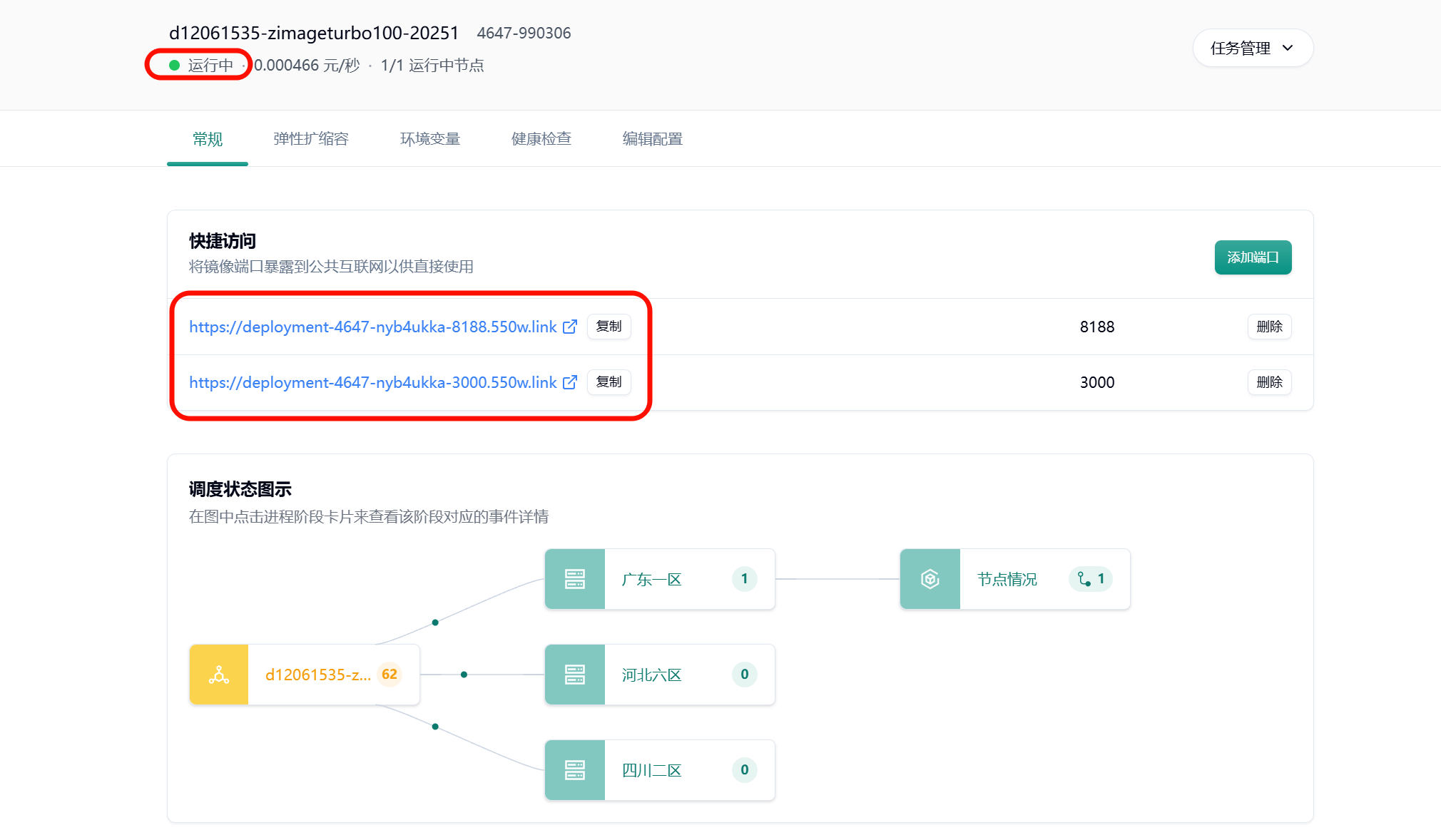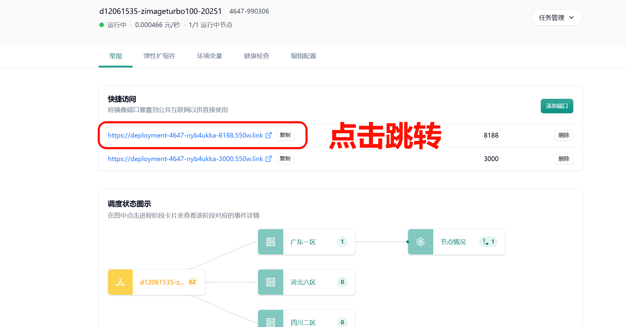 Section titled “7. 进入 comfyui 界面”系统会自动分配一个可公网访问的域名,点击图示链接跳转 comfyui 界面