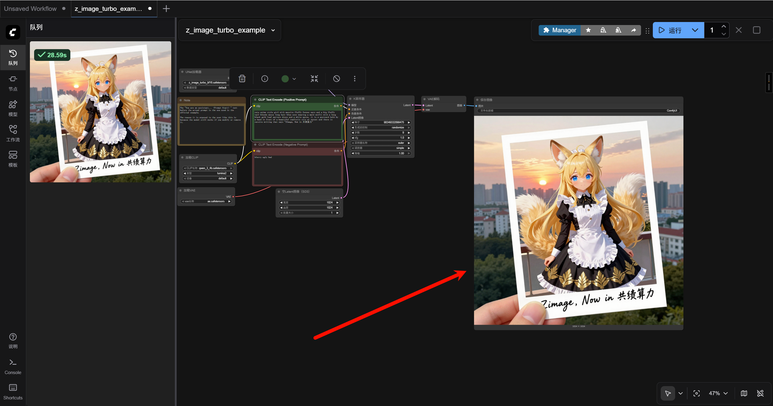 稍等片刻,即可在后方的“保存图像”节点看到基于我们提示词生成的图片。右键点击图片,选择“Save Image”即可保存图片。