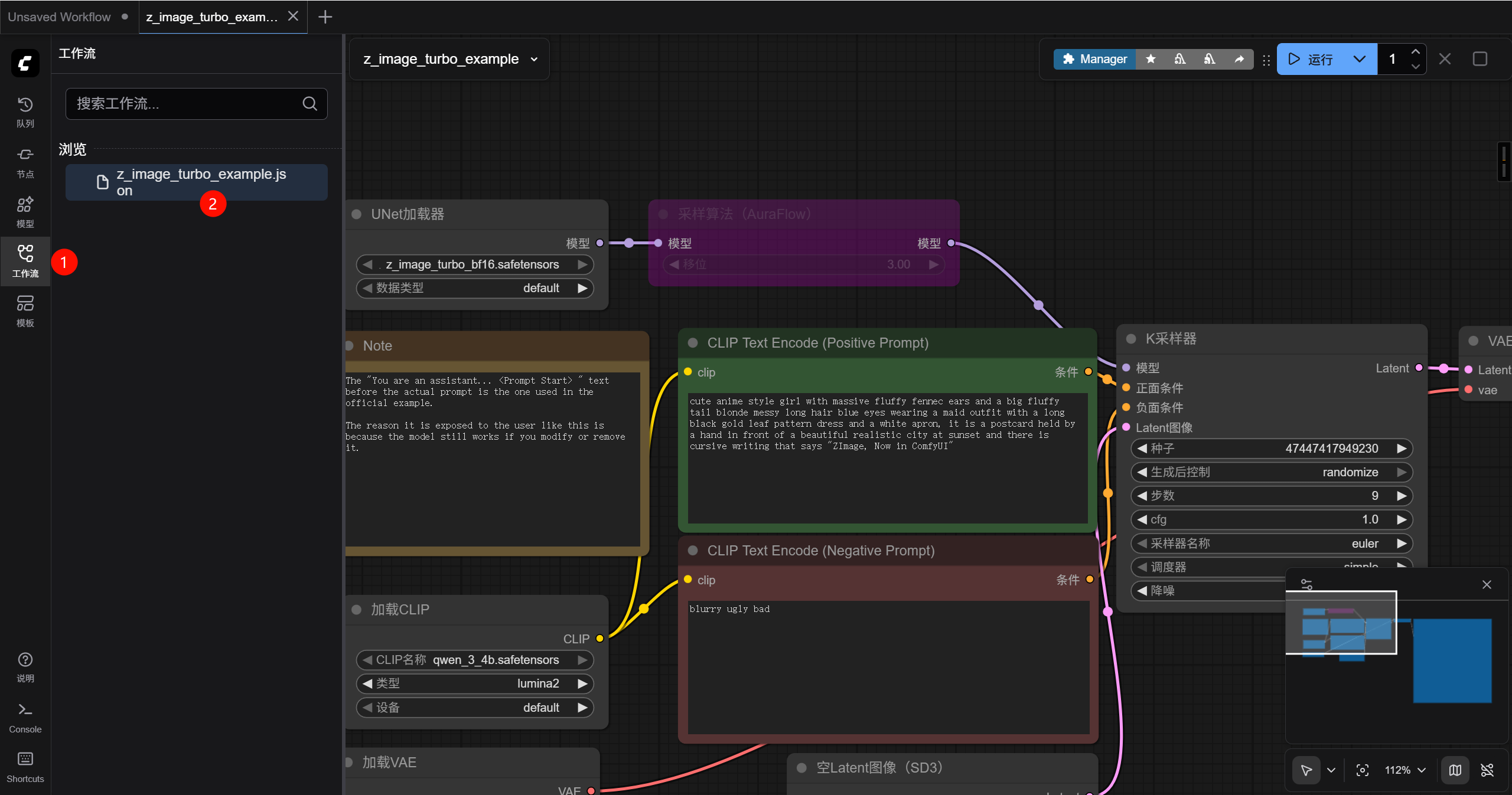 进入 comfyui 界面以后按下图序号先选择左侧栏的工作流菜单,再点击打开默认的 z_image_turbo_example.json 文件,此时可以发现这是一份默认的测试工作流