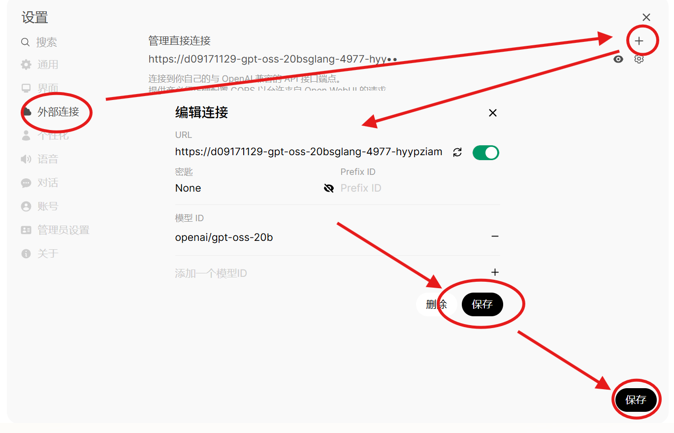 【管理员设置】-> 【外部连接】->【管理直接连接】->【URL】->【密钥】->【模型 ID】->【保存】->【保存】