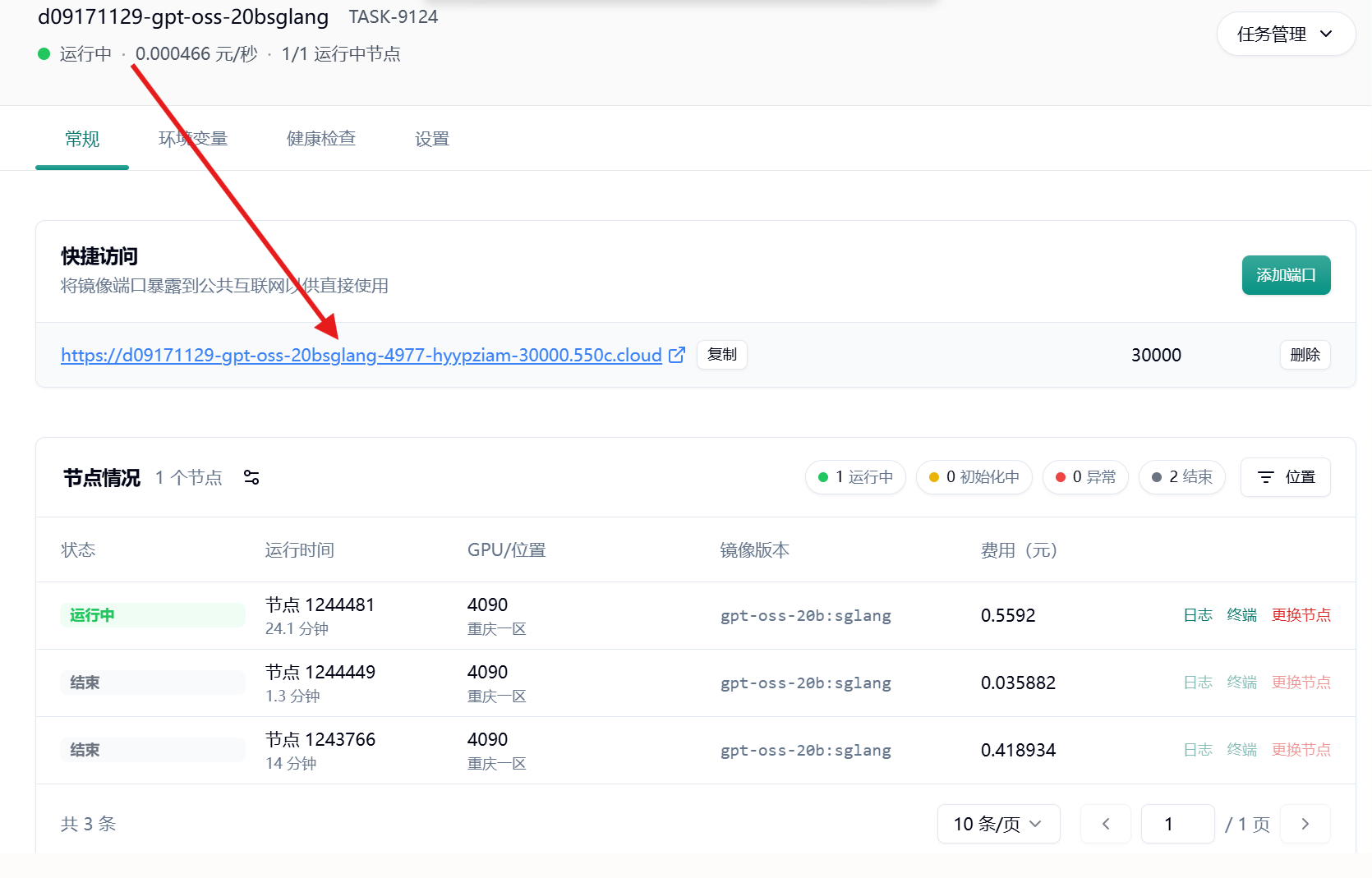 此时 OpenAI-Compatible APIs 服务 URL 为:https://xxxxxxxx-xxxx-xxx-xxxxxxxx.30000.550c.cloud/v1 (红色箭头所指向,某些平台上 “/v1” 需要自己添加)