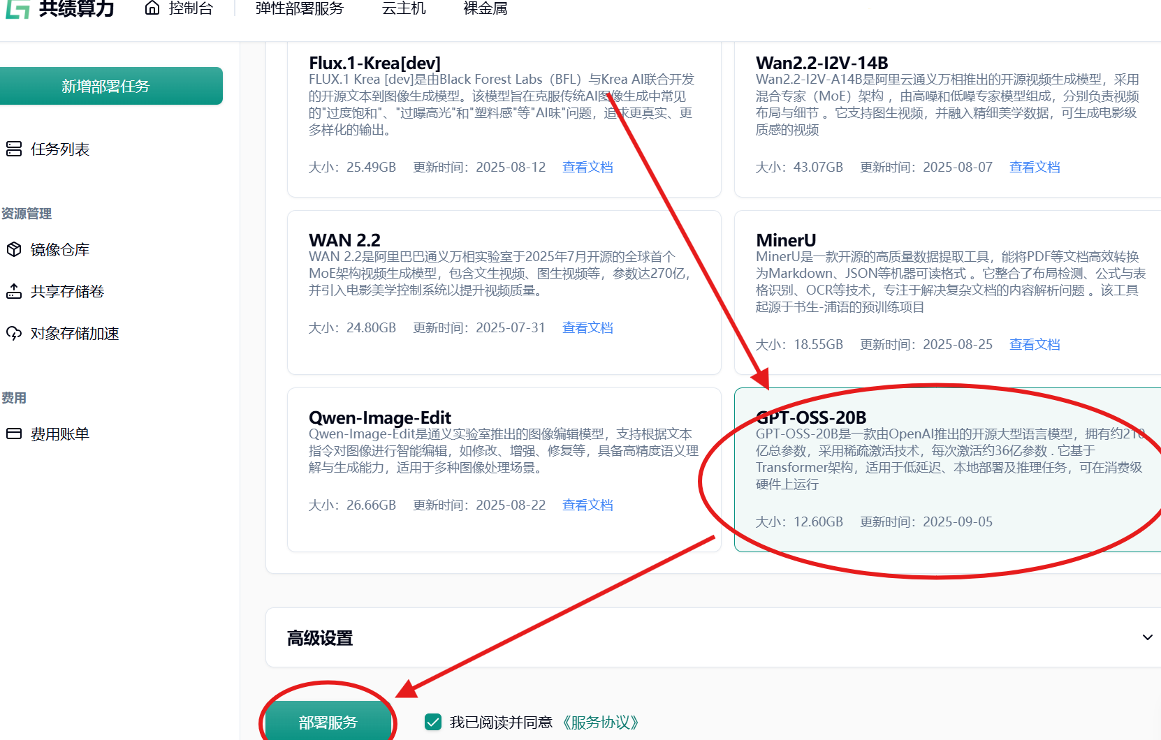 在【服务配置】选项选择【GPT-OSS-20B】-> 【部署服务】