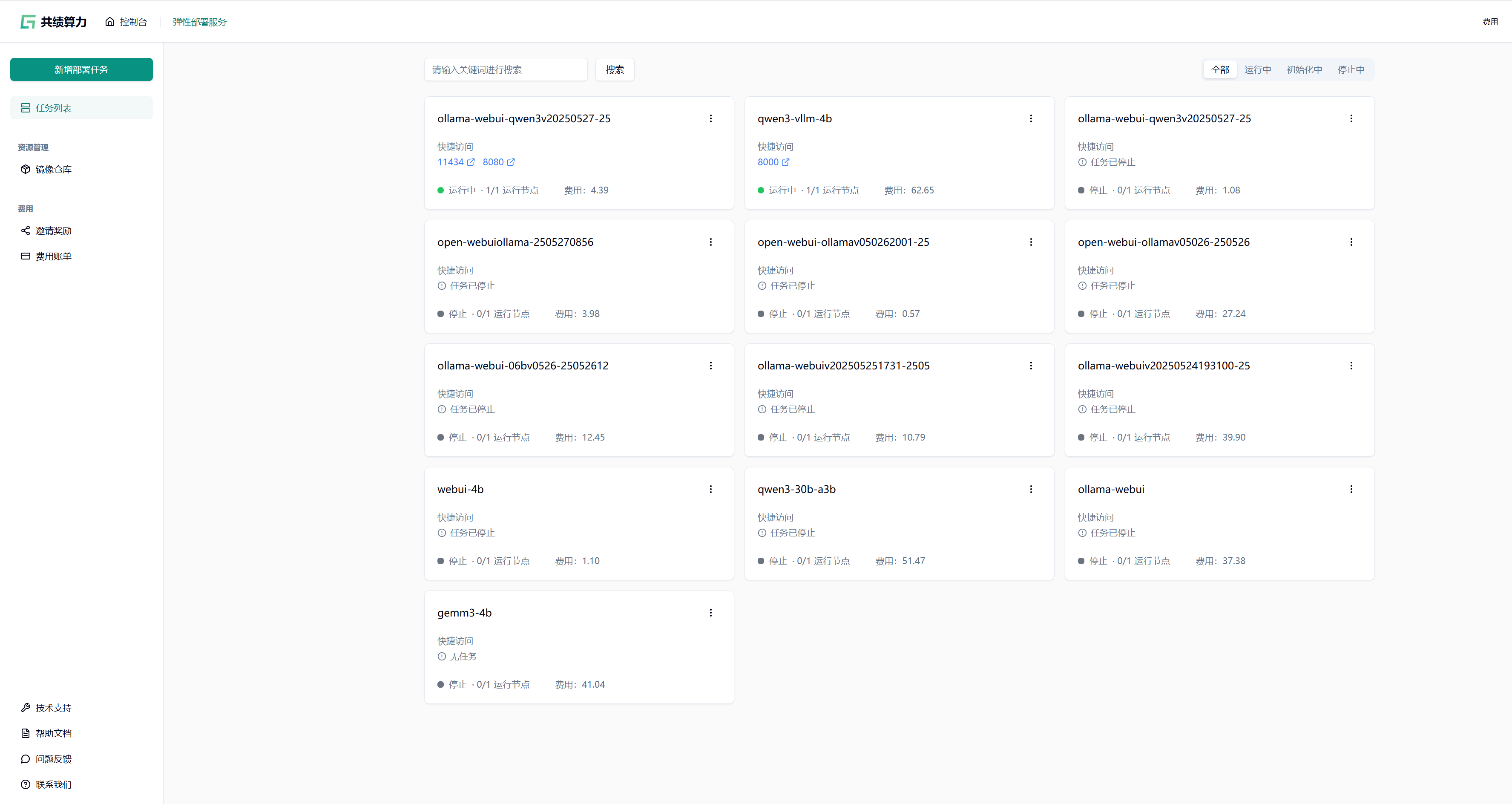 Section titled “1.1 创建部署服务”登录共绩算力控制台,在控制台首页点击“弹性部署服务”进入管理页面。首次使用需确保账户已开通弹性部署服务权限。