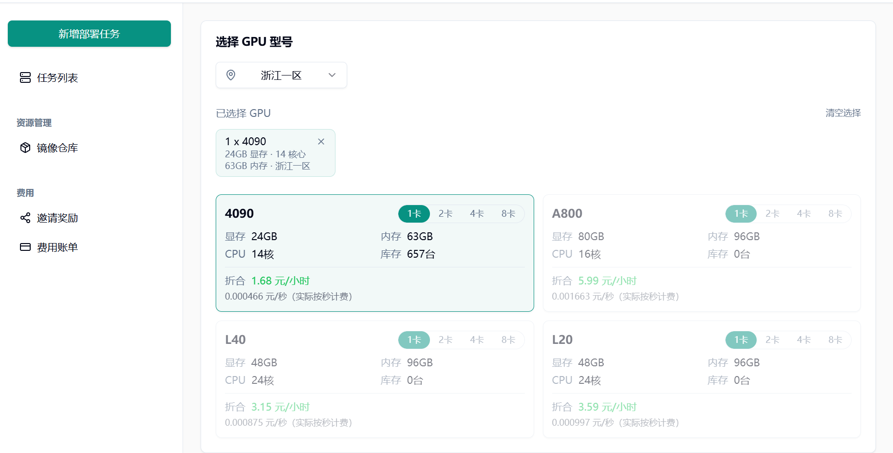 Section titled “1.2 选择 GPU 型号”根据实际需求选择 GPU 型号: