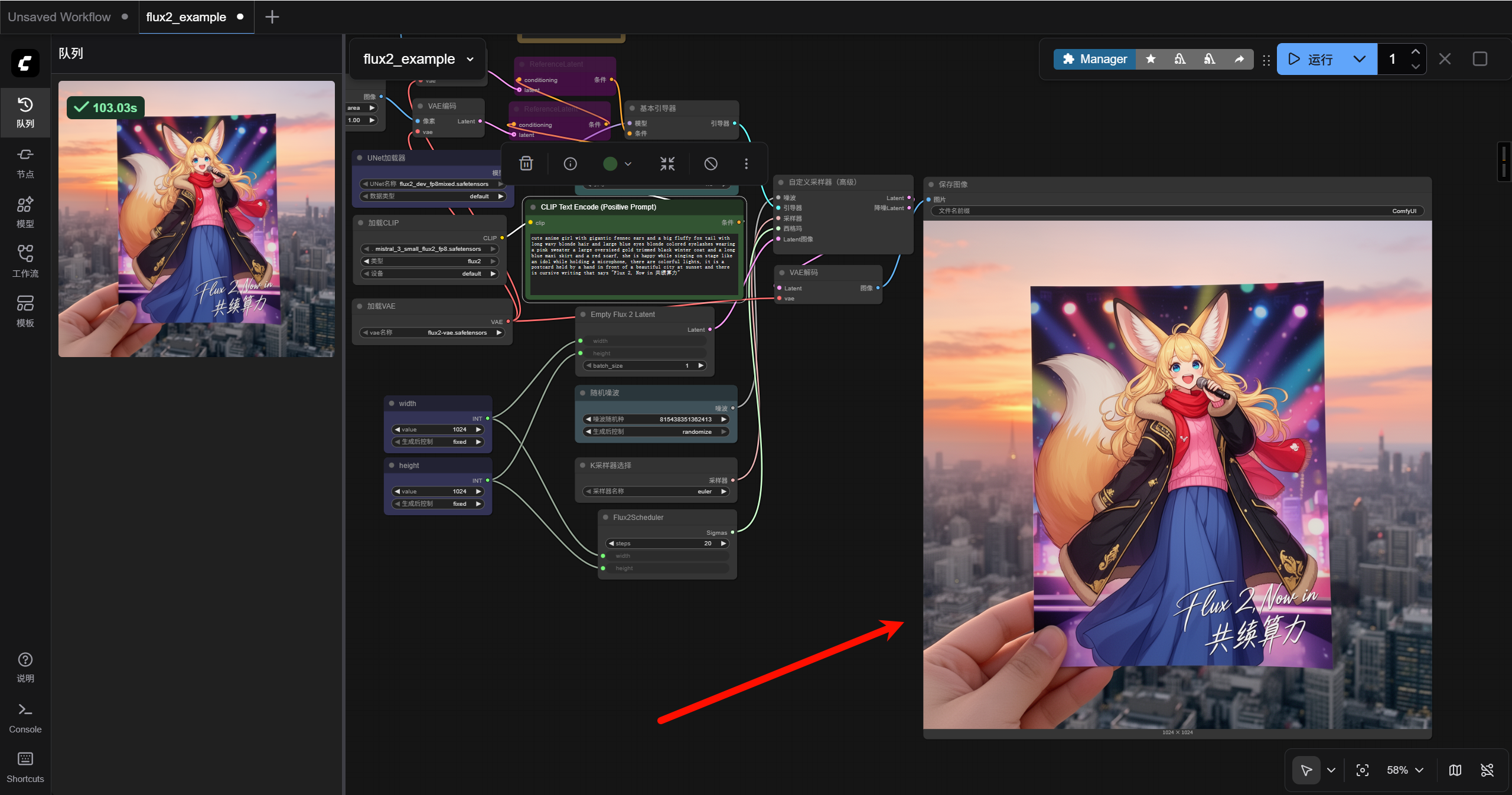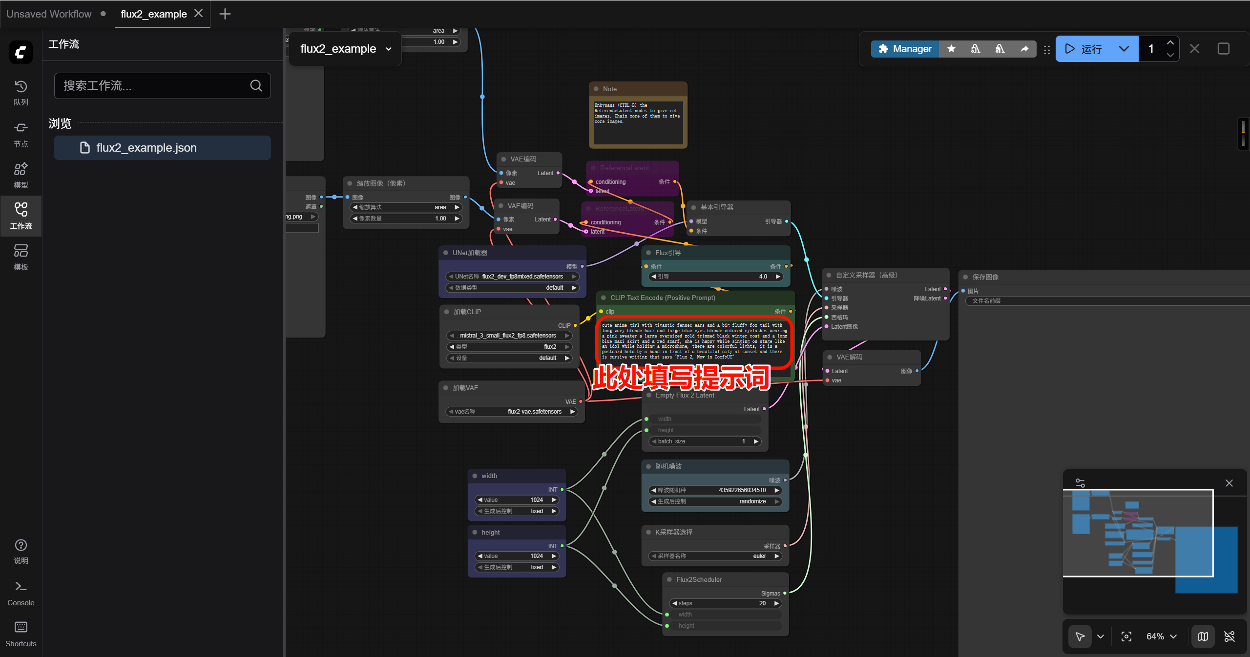 进入 comfyui 界面以后按下图序号先选择左侧栏的工作流菜单,再点击打开默认的 flux2_example.json 文件,此时可以发现这是一份默认的测试工作流