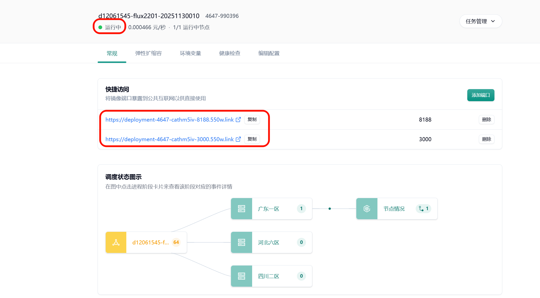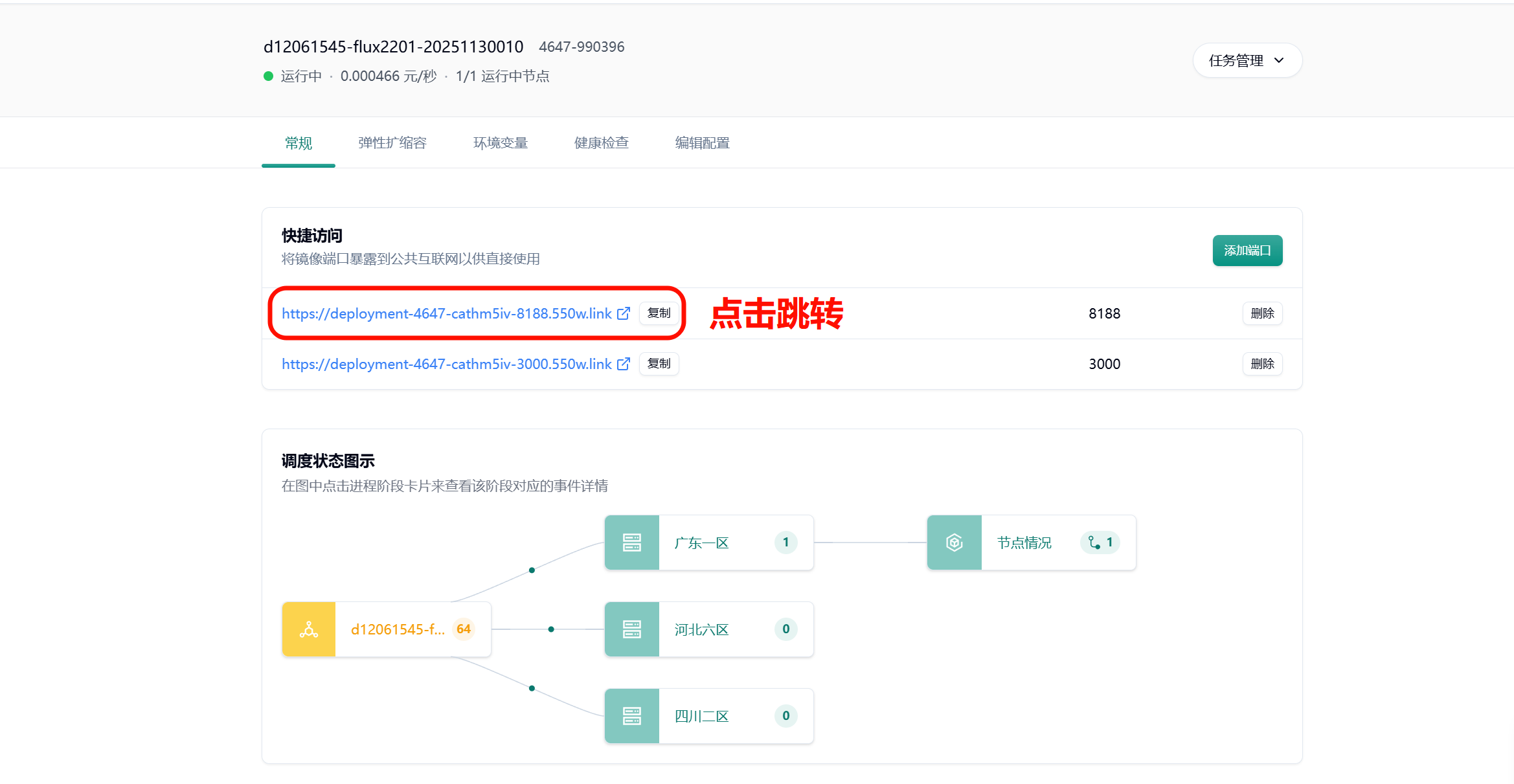 Section titled “7. 进入 comfyui 界面”系统会自动分配一个可公网访问的域名,点击图示链接跳转 comfyui 界面
