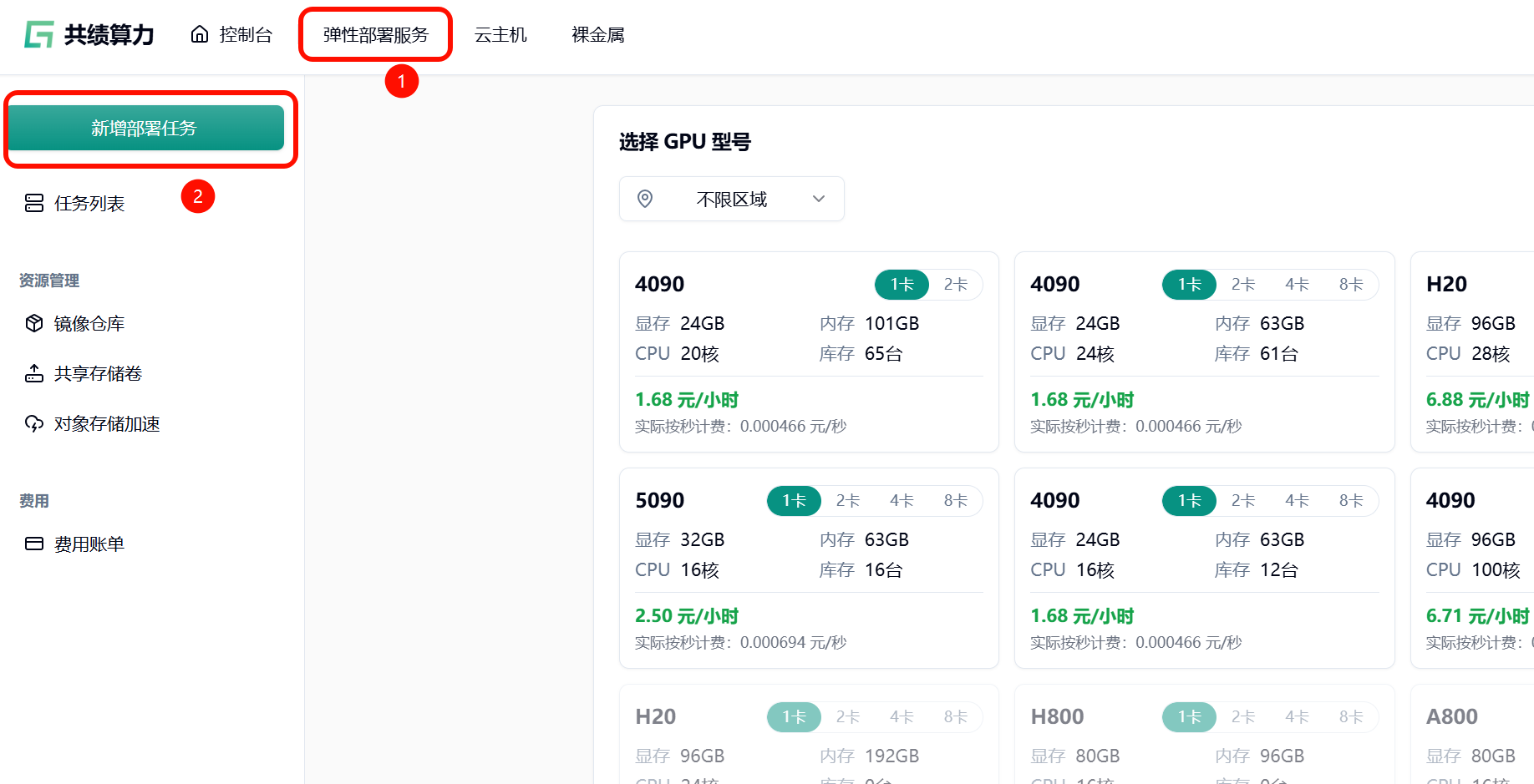 Section titled “1. 访问控制台进入弹性部署界面”共绩算力控制台:https://console.suanli.cn/dashboard