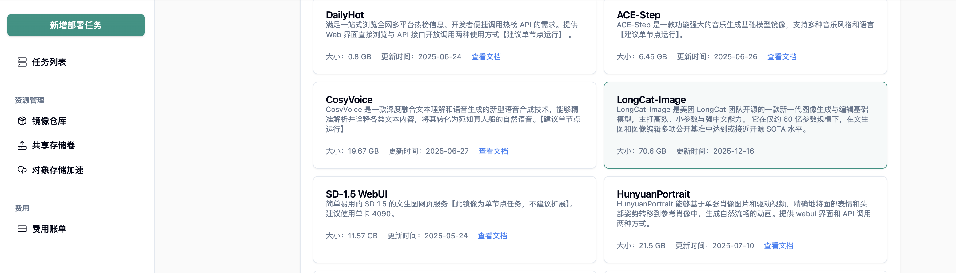 Section titled “1 部署步骤”我们提供了构建完毕的 LongCat-Image 镜像可以直接部署使用。