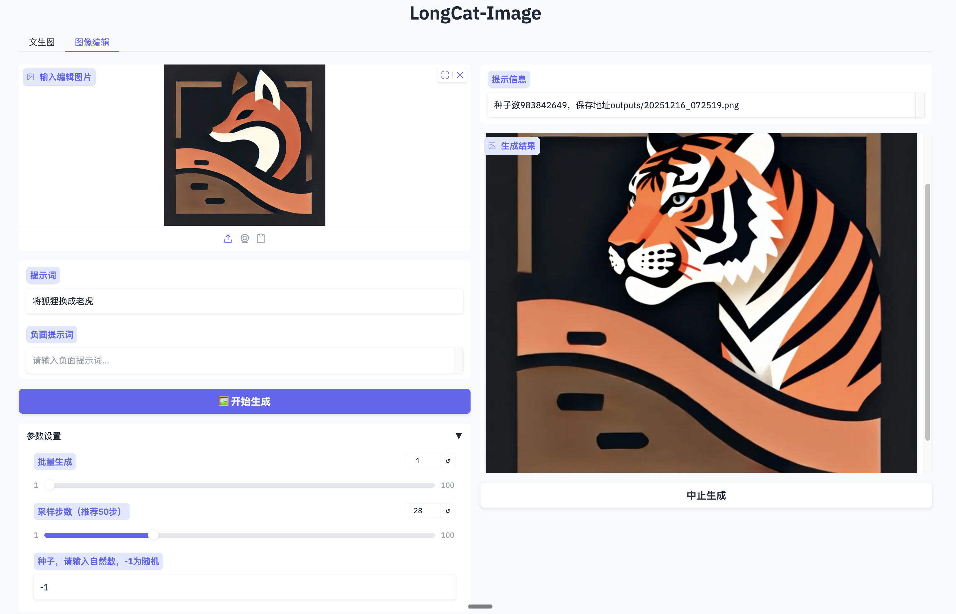 Section titled “2.2 LongCat-Image-Edit 图片编辑”在左上角的 tab 中选择「图像编辑」,点击或者拖拽图片上传后添加提示词以及对应参数,点击「开始生成」后等待结果即可: