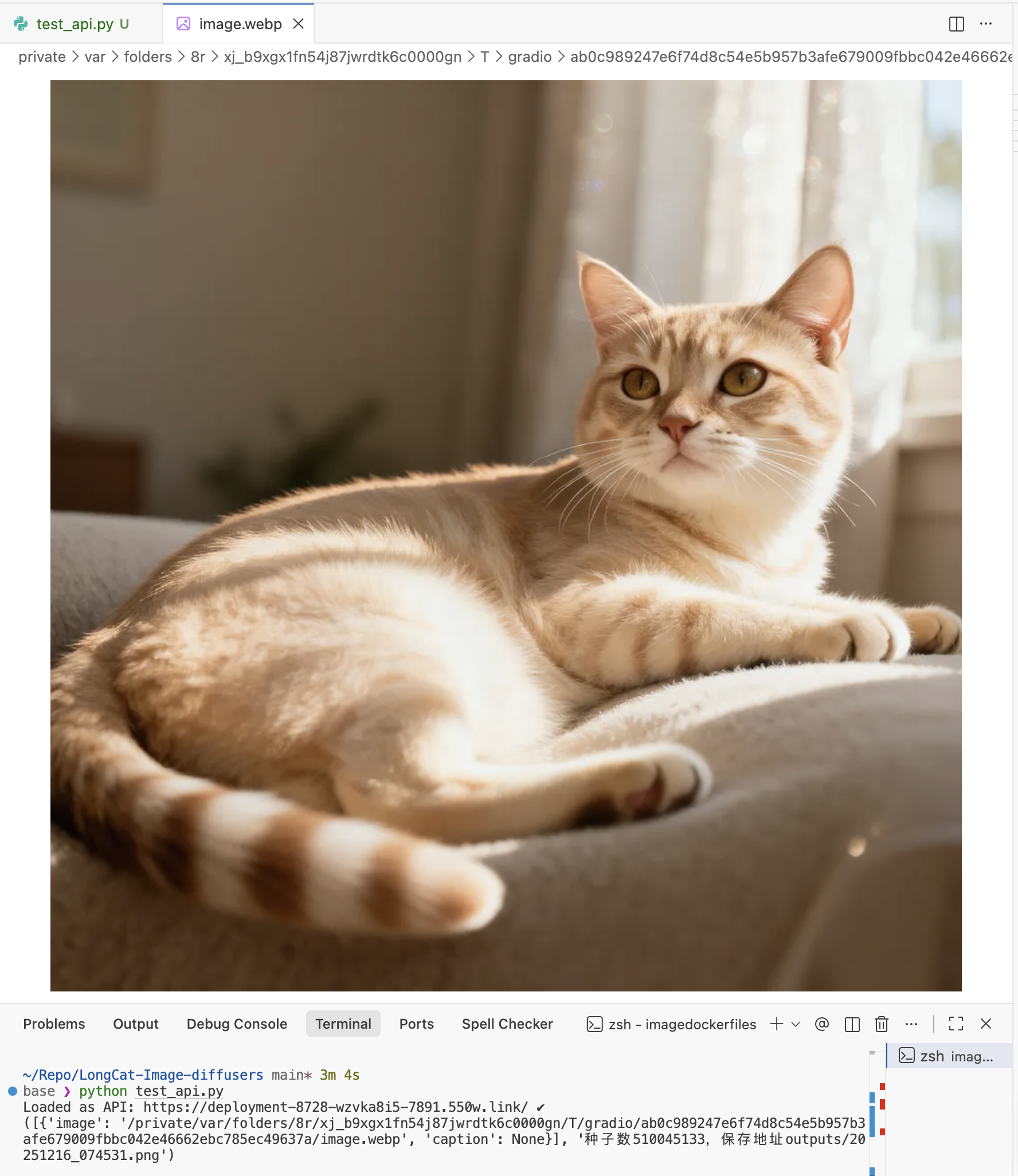 client = Client("https://deployment-8728-wzvka8i5-7891.550w.link/")result = client.predict( prompt="A photo of a cat", negative_prompt="", width=1024, height=1024, num_inference_steps=28, batch_images=1, seed_param=-1, api_name="/generate_t2i")print(result)