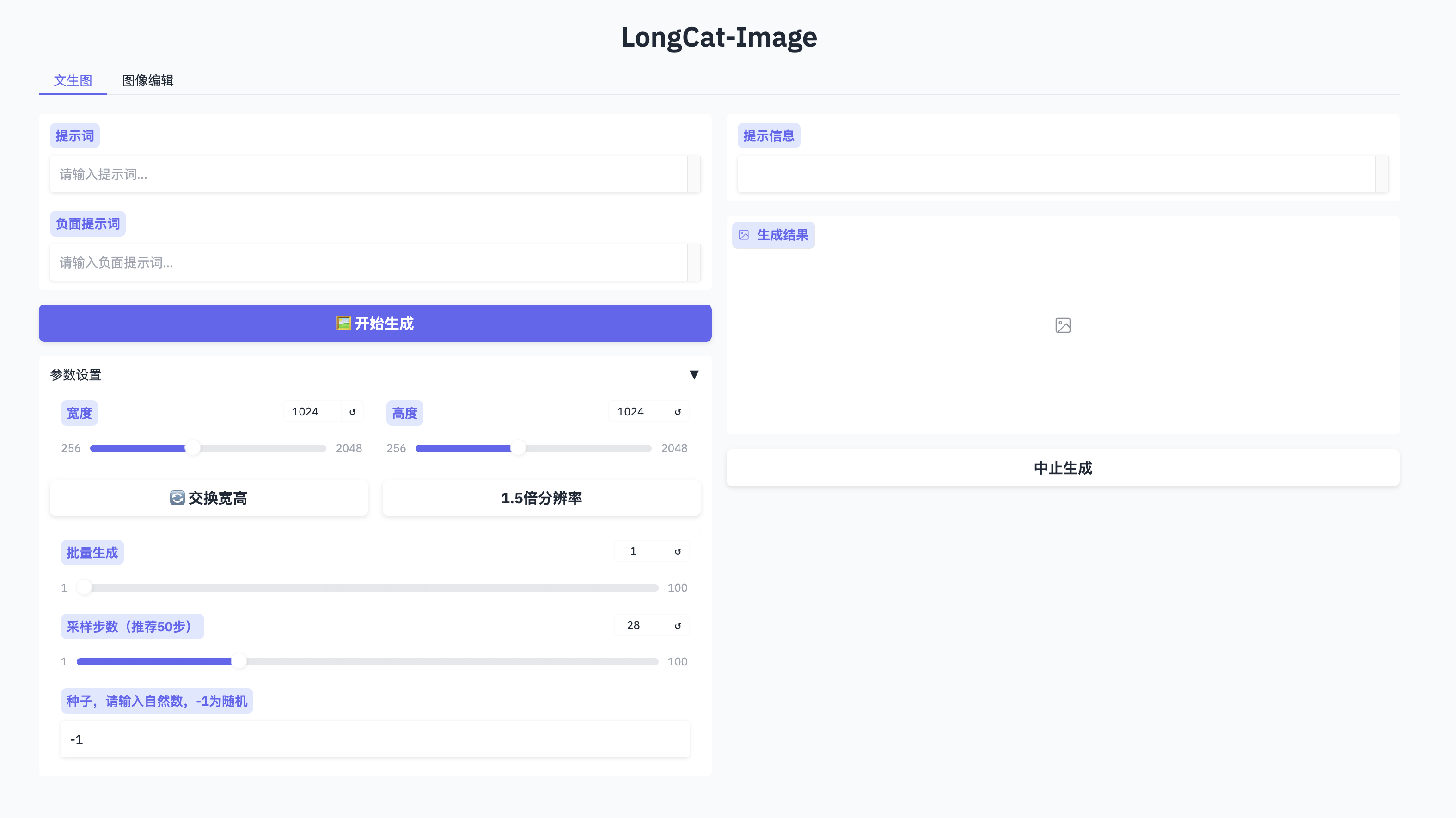 Section titled “2.1 LongCat-Image 文生图”打开链接后默认为「文生图」部分: