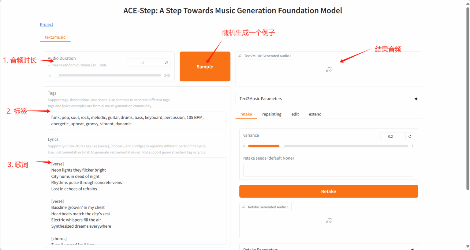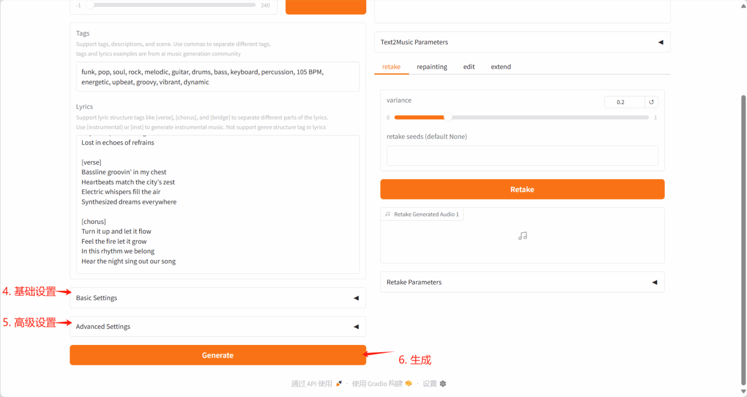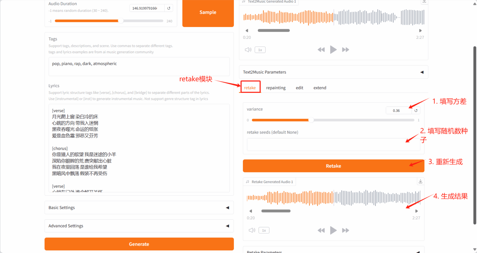 Section titled “2.2 Retake Tab”- 通过不同种子值重新生成音乐并产生细微变化