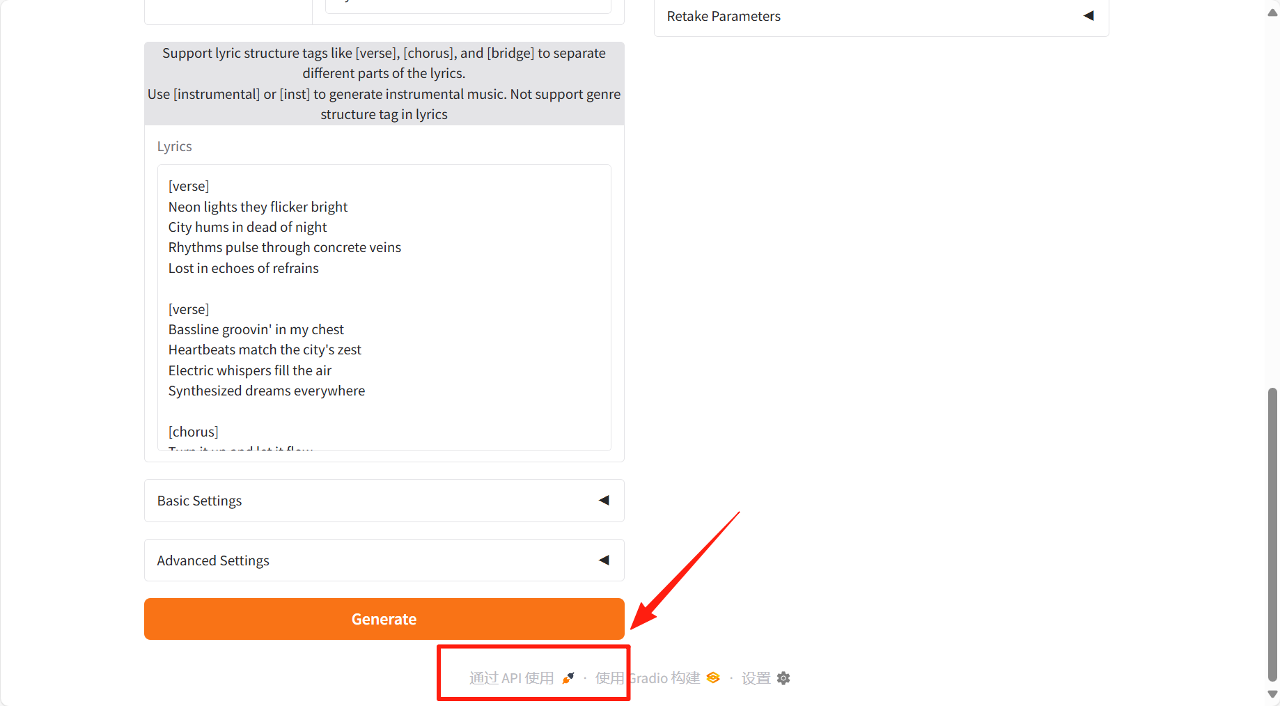 - Lyrics:输入带有结构标签的歌词,如 [verse] 、 [chorus] 、 [bridge]