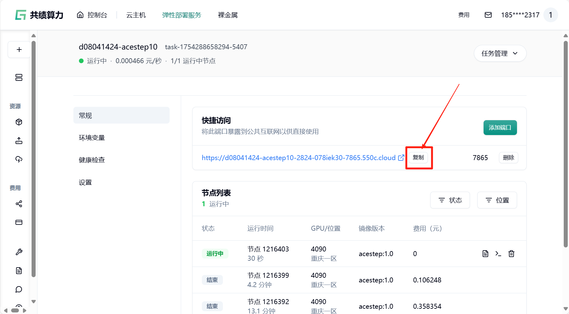 部署完成后,在“快捷访问”中找到端口为 7865 的公网访问链接,点击即可在浏览器中使用 ACE-Step 的 Web 界面,或通过该地址调用 API 服务。