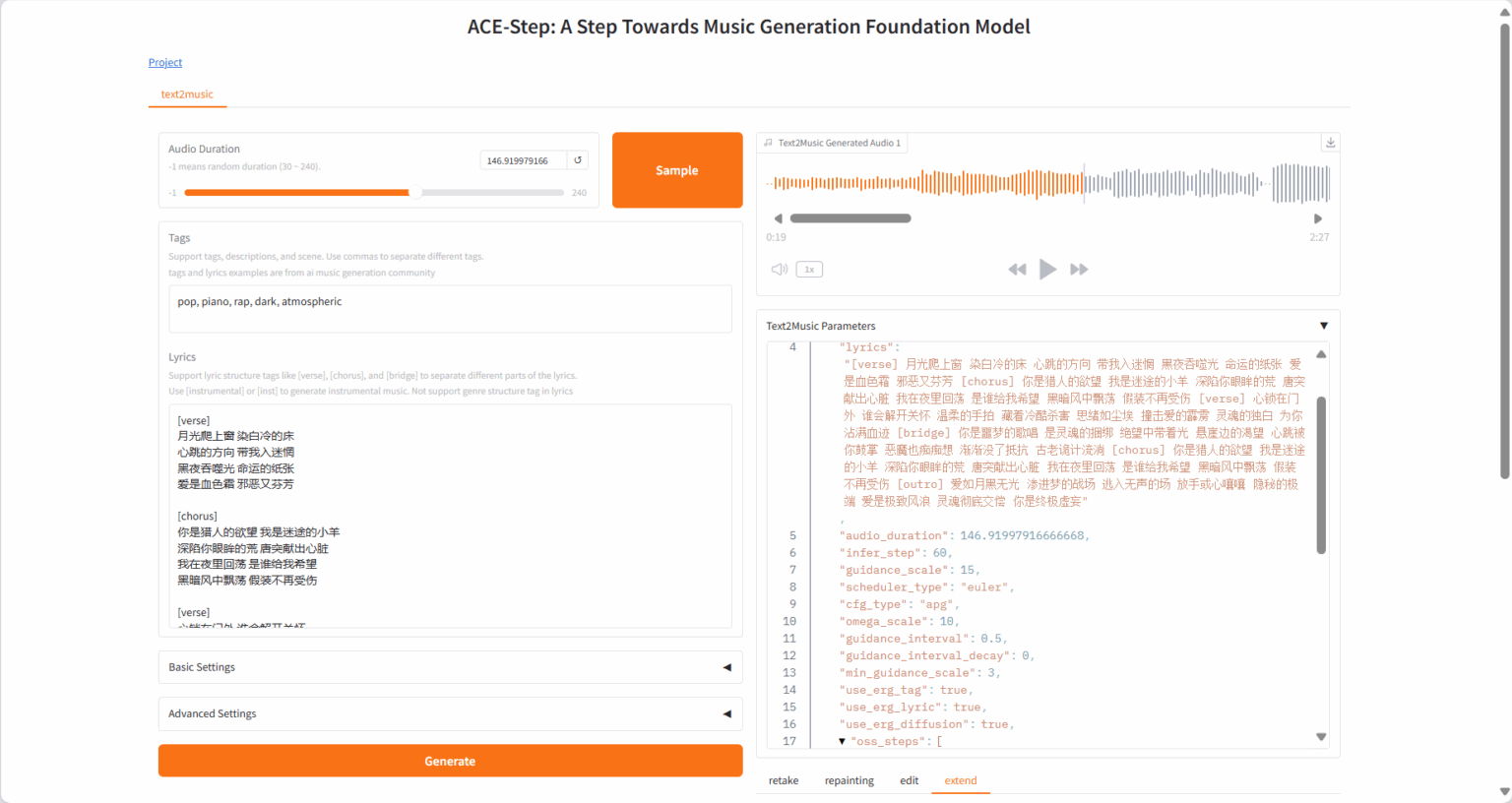 audio_duration, tags, lyrics, infer_step, guidance_scale, ... = result- 重绘音乐片段(