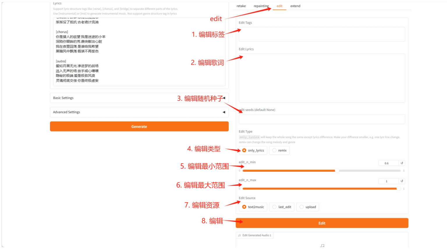 Section titled “2.3 Edit Tab”- 通过修改标签或歌词来改编现有音乐