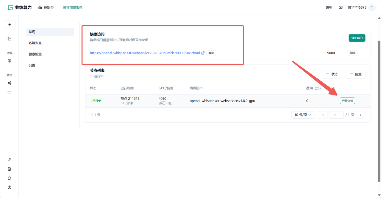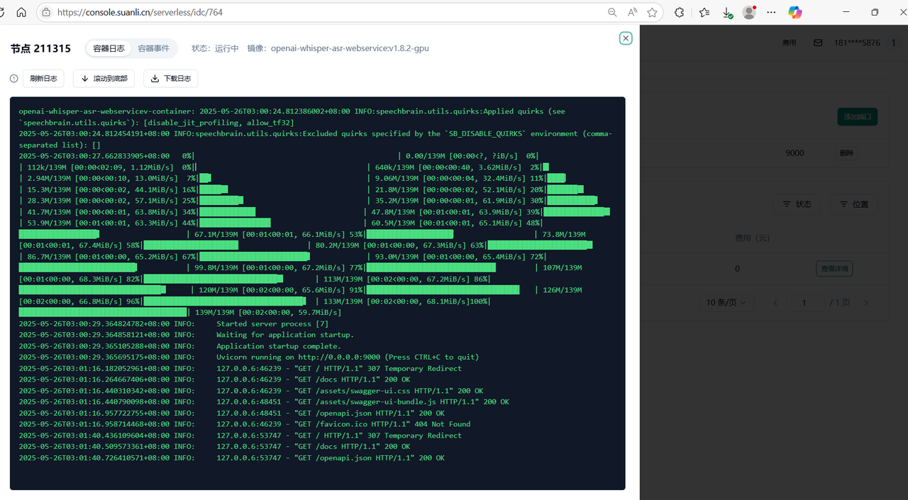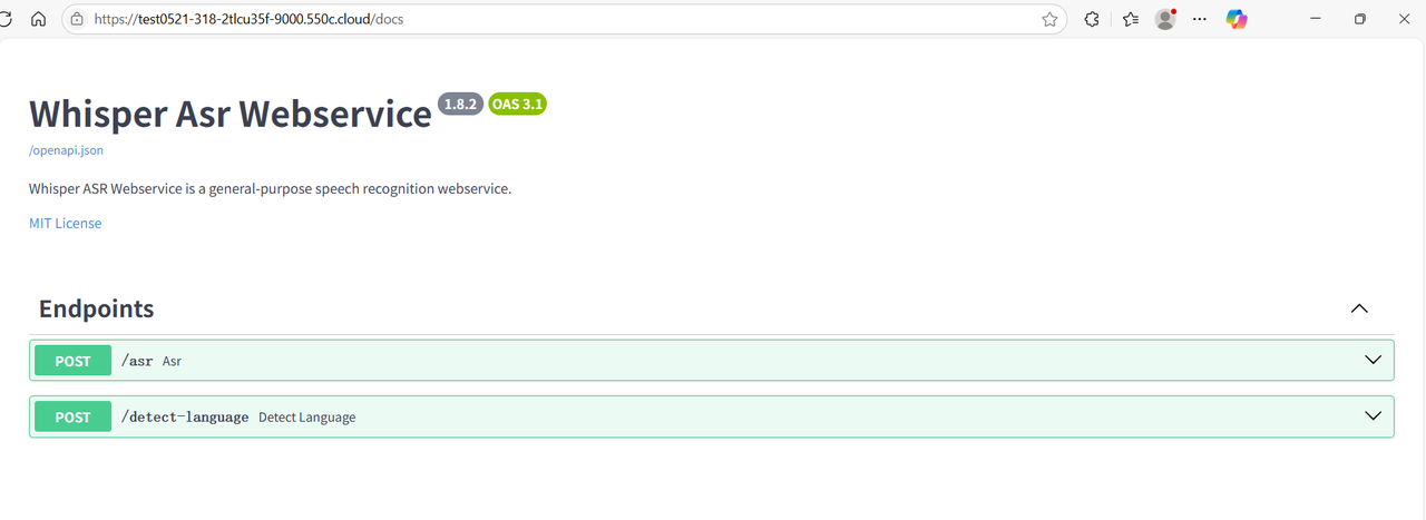1.7 我们可以点击“9000”端口的链接,测试 whisper 部署情况,系统会自动分配一个可公网访问的域名,接下来我们即可自由地使用 whisper 的服务