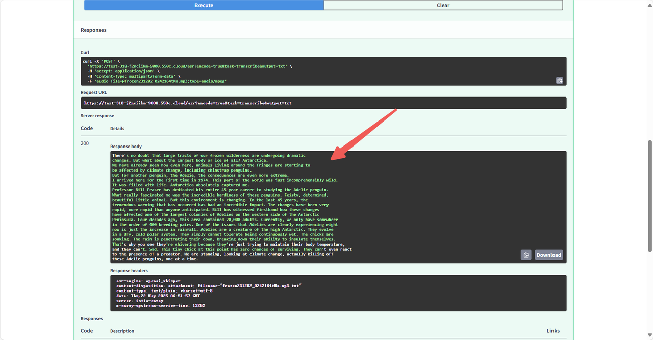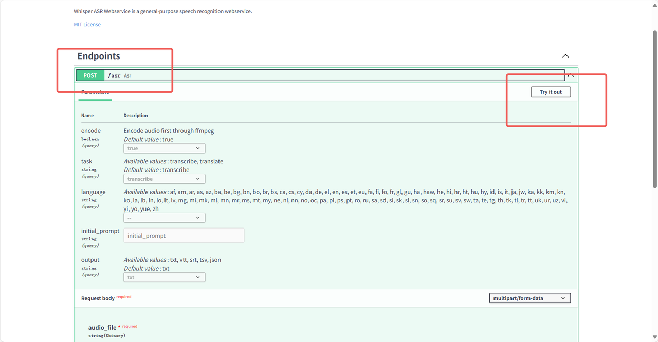 Section titled “4.1 英文音频转文字”点击 /asr:语音识别接口 后点击页面右上角 Try it out 开始使用。