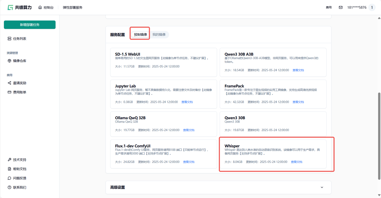 Section titled “1. 部署步骤”我们在服务配置——预制镜像中提供了预构建的 Whisper 容器映像,旨在满足一般要求。您可以选择直接在共绩算力上运行这些容器以执行任务。或者,您还可以通过使用我们资源管理——镜像仓库所提供的免费 Docker 镜像仓库服务,来方便管理您自身的 Docker 镜像。