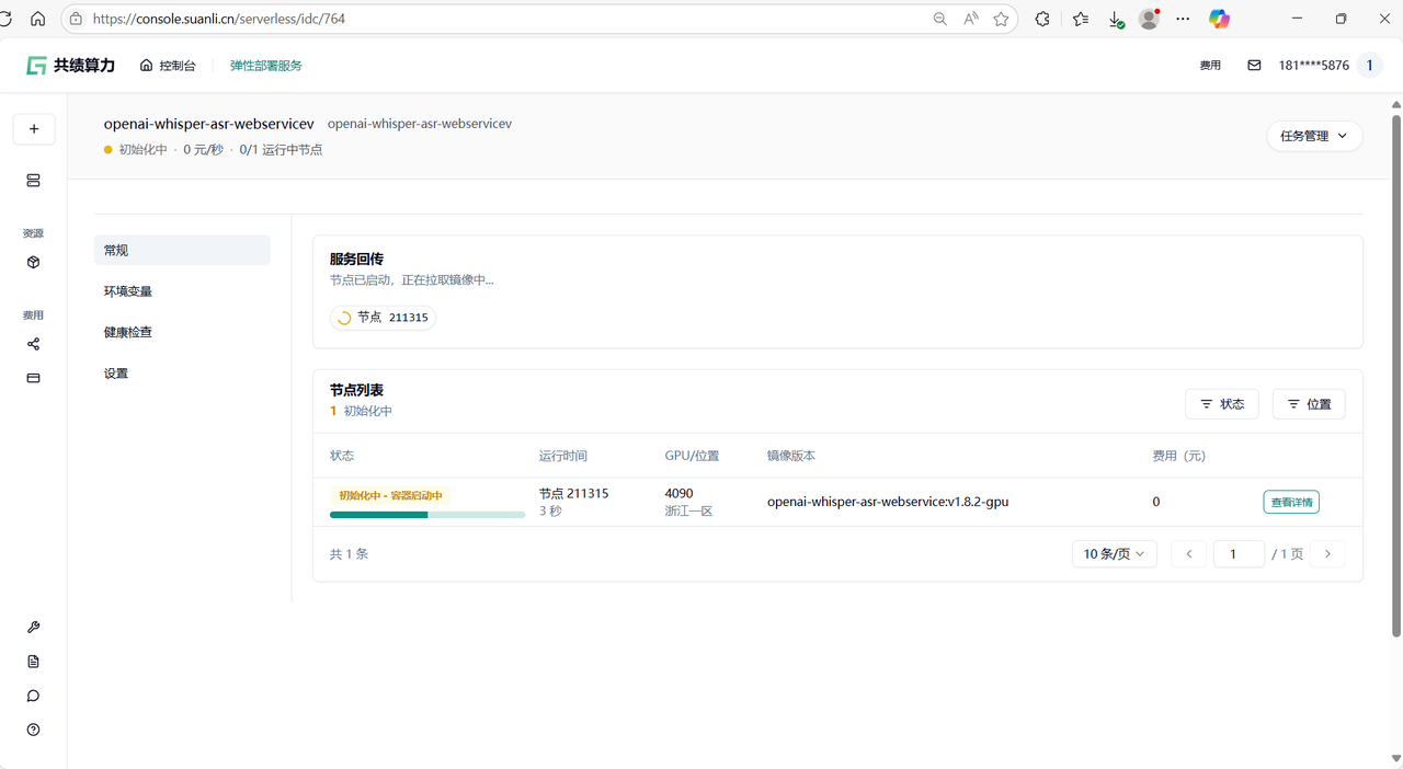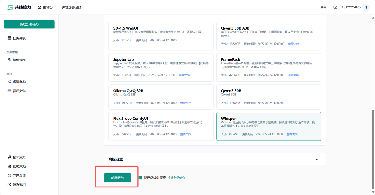 1.5 点击部署服务,耐心等待节点拉取镜像并启动 第一次访问会下载模型,所以需要稍等一会