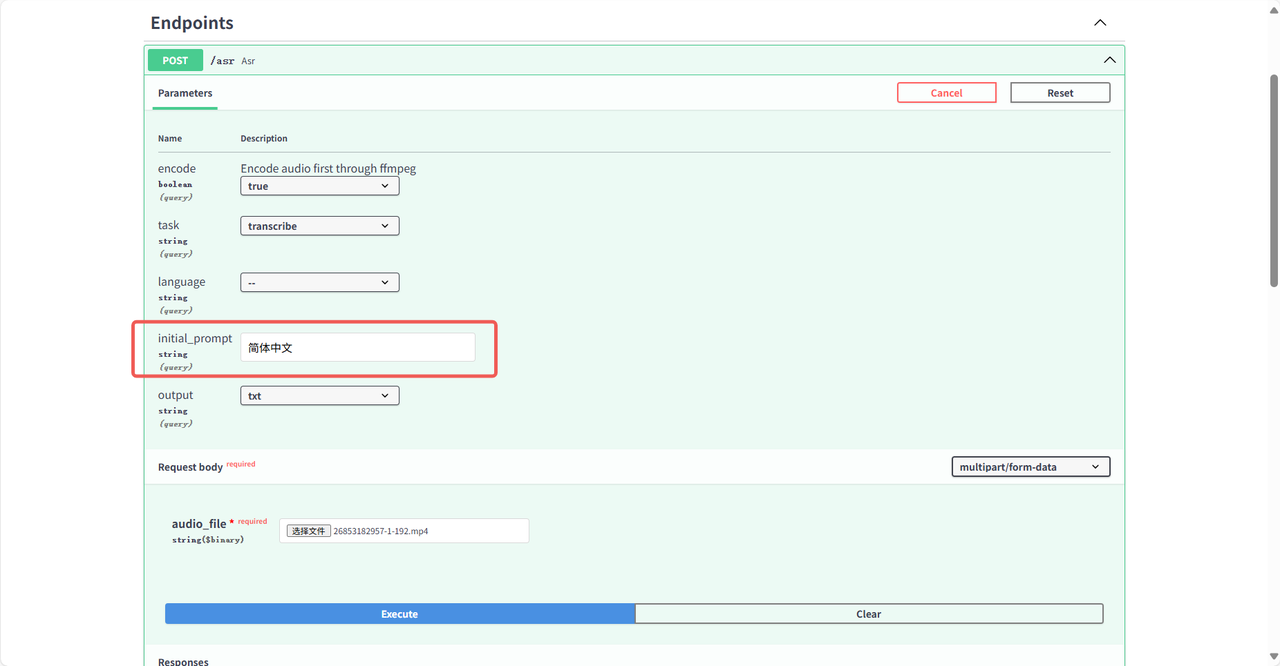 file:必填,上传音频/视频文件(.mp3, .wav, .mp4, .mov 等)
