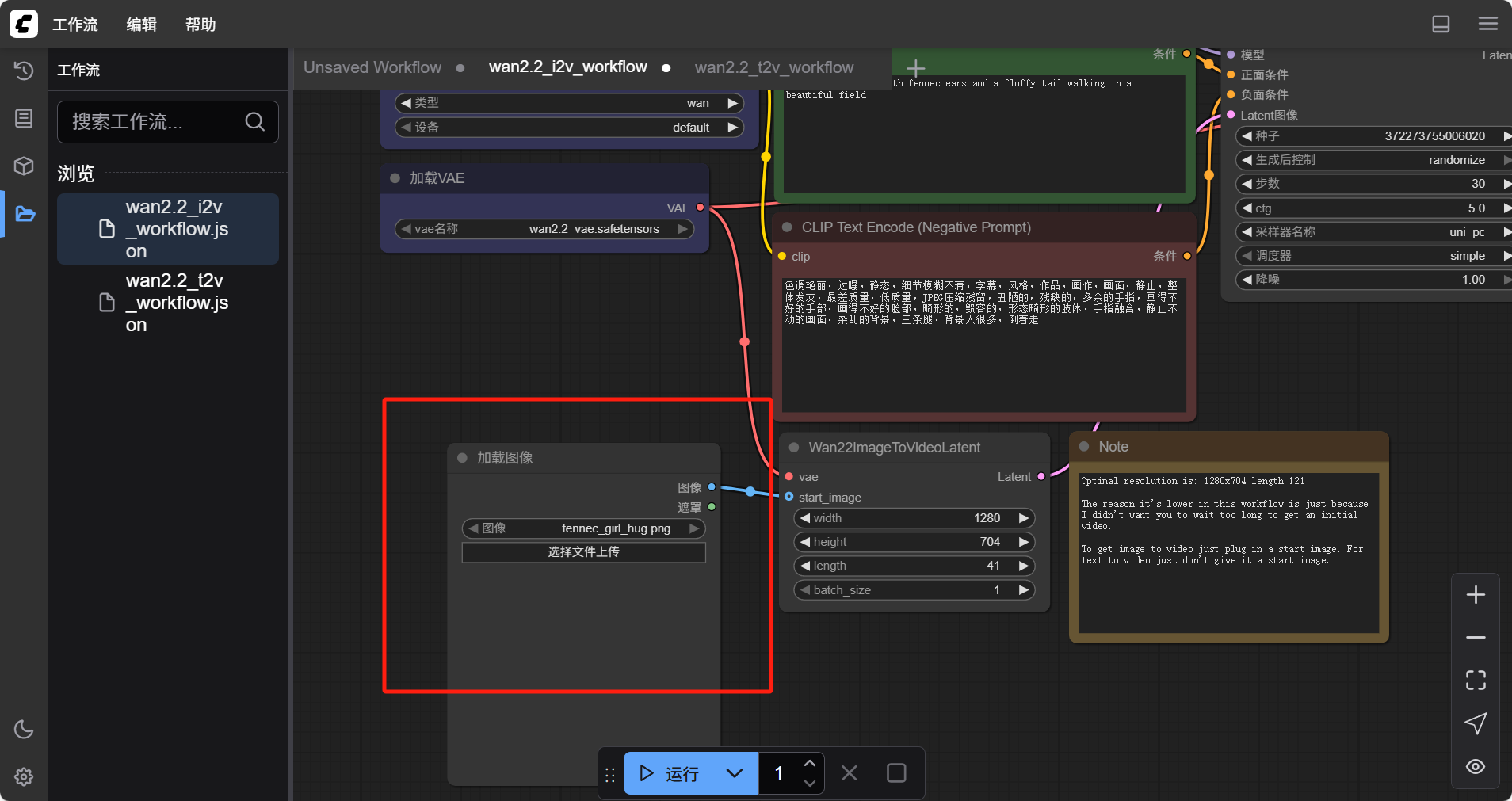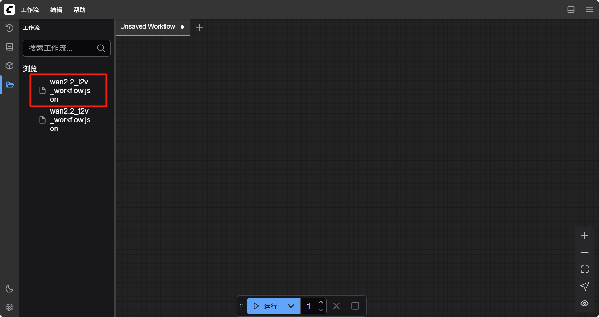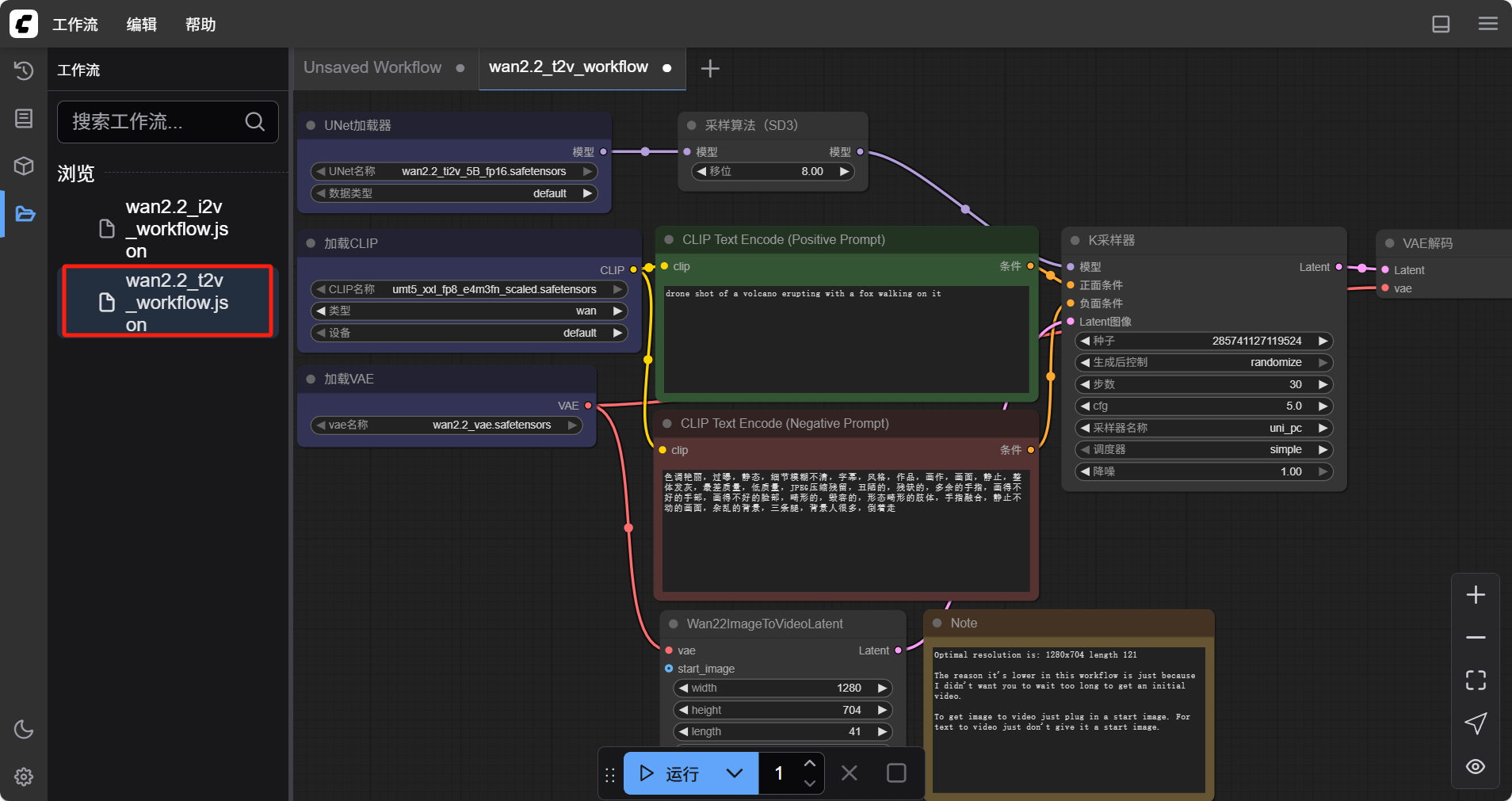 同时,WAN2.2 也支持文生视频。选择左侧的“工作流“菜单,找到名为”wan2.2_t2v_workflow.json“的工作流文件,鼠标双击进行插入。