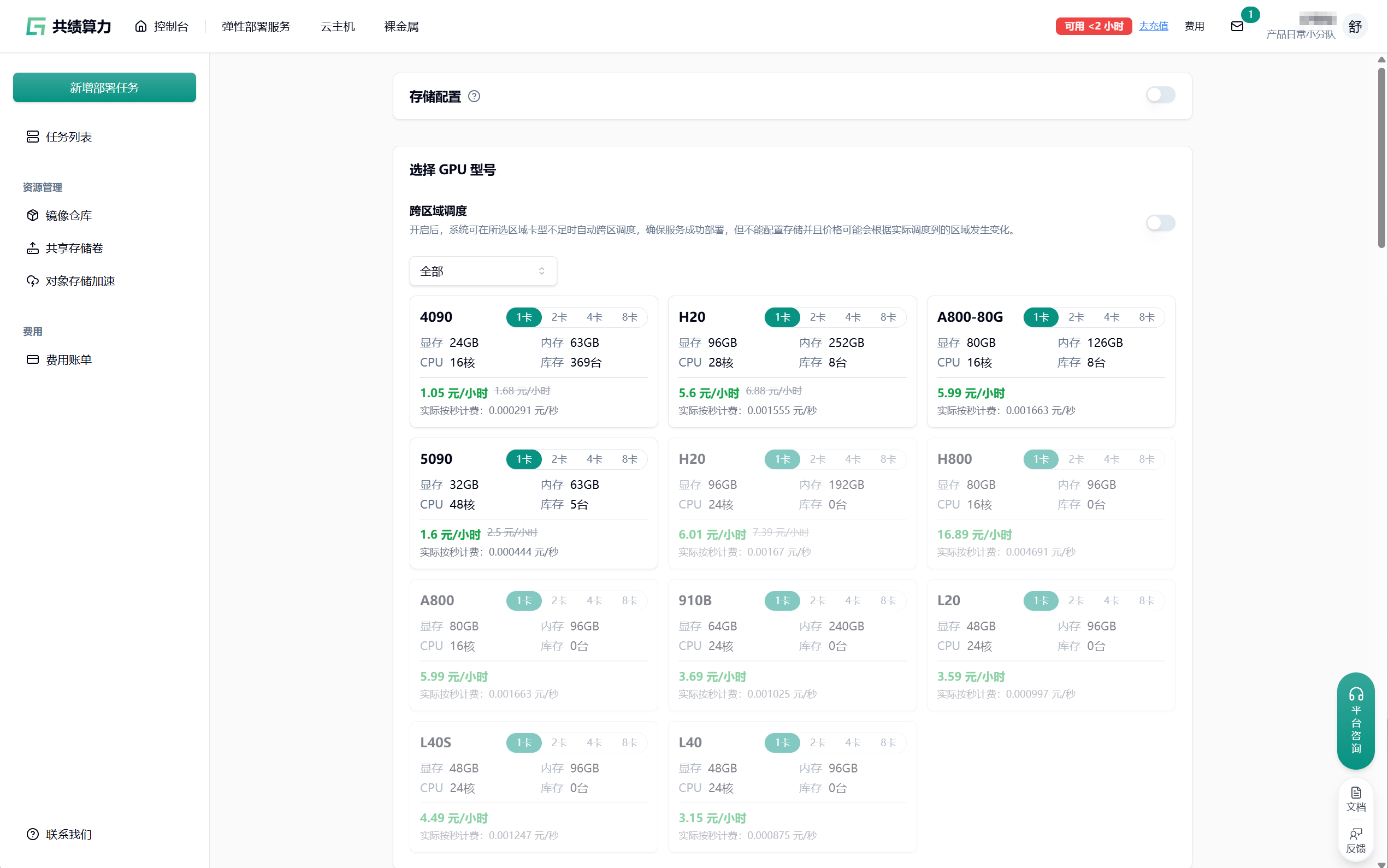 Section titled “2.1 选择计算资源”根据业务需求筛选 GPU 资源,包括: