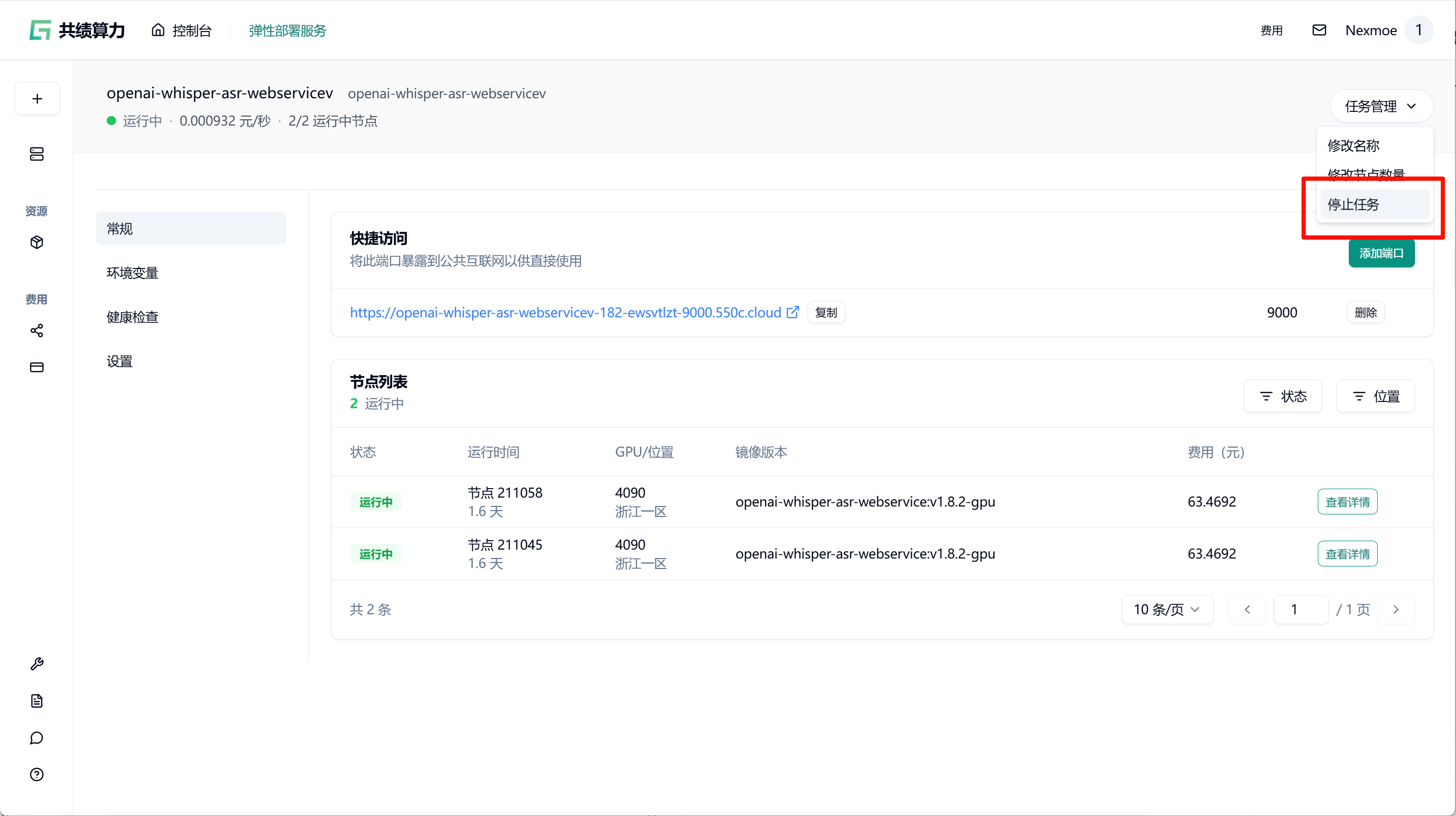 注:停止服务后,GPU即释放,历史缓存数据也会释放;镜像会保存在任务列表中,后续可随时重启,无需重复拉取镜像